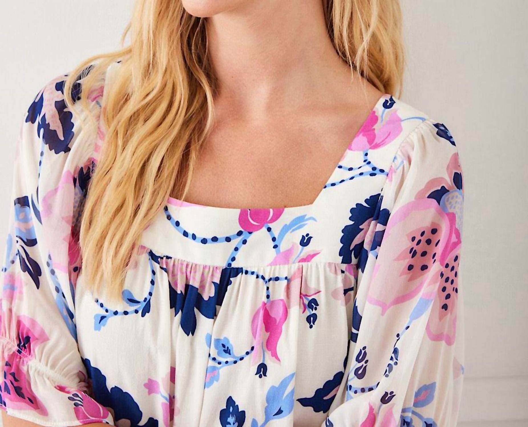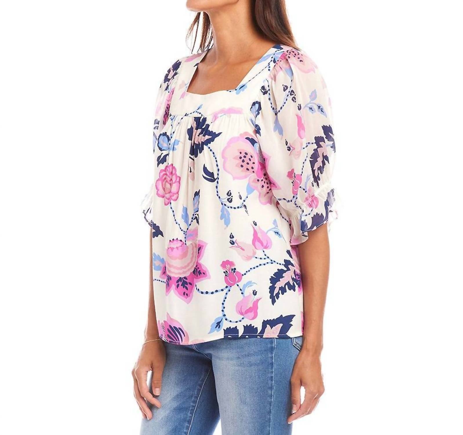 Pair this with your favorite jeans and slides for your next girls night out. Elevate your wardrobe with the Contrast Square Neck Top by Karen Kane, an ideal choice for both casual and special occasions. Crafted from 100% Viscose, this imported piece showcases elbow-length puff sleeves and a charming floral pattern. The top measures 24 7/8 inches in length for size M and features a pull-on closure. Care instructions include hand washing separately and laying flat to dry or opting for dry cleaning.