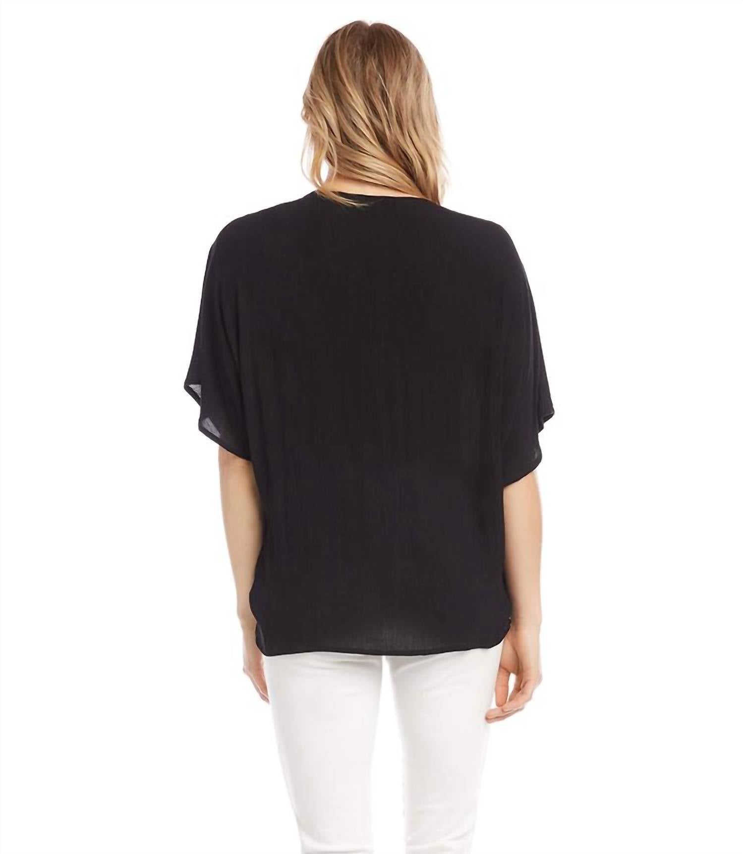 A timeless blouse that will never go out of style. Introducing the Short Sleeve Buckle Front Top by Karen Kane in an elegant black hue, perfect for elevating your casual wardrobe. This blouse boasts elbow sleeves and a stylish V-neck, featuring a twist at the hem with a distinctive rattan buckle detail. Crafted from 100% rayon, it measures approximately 23.375 inches from the back of the neck to the hem for a size medium. Made in India, this pullover style is best maintained through dry cleaning.