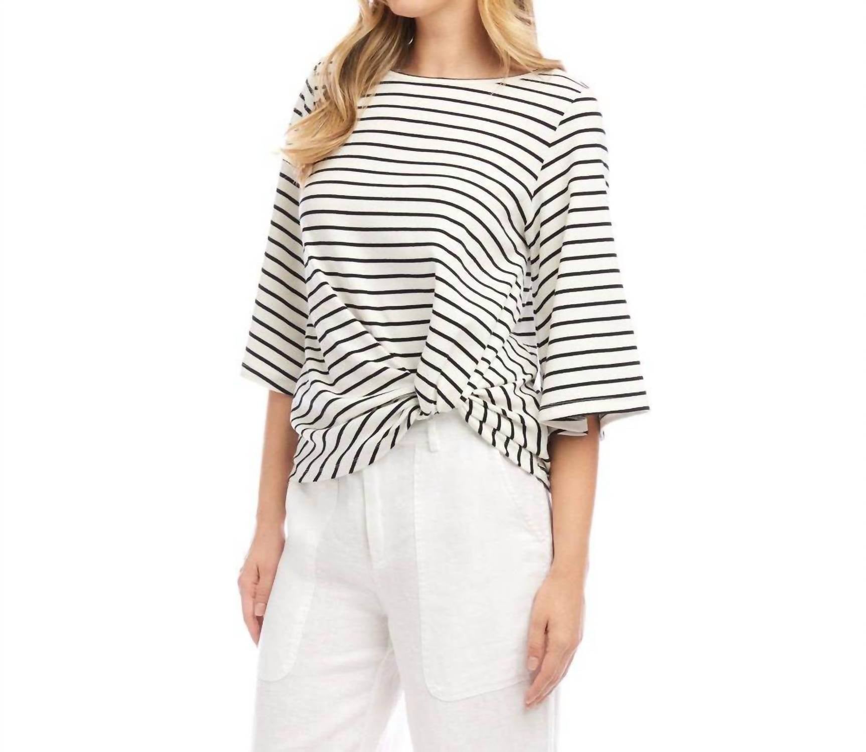 A versatile blouse that works from desk to dinner! Elevate your ensemble with the Stripe Flare Sleeve Pick-Up Top by Karen Kane, a chic choice in white with black stripes. This top, originating from imported materials, features long flare sleeves and a relaxed fit, making it perfect for both casual and sophisticated gatherings. Crafted from a 95% Cotton, 5% Elastane blend, it boasts a flattering 22.5-inch length and a stylish front twist hem. Closure: Pull on. Care: Machine wash cold, tumble dry low.