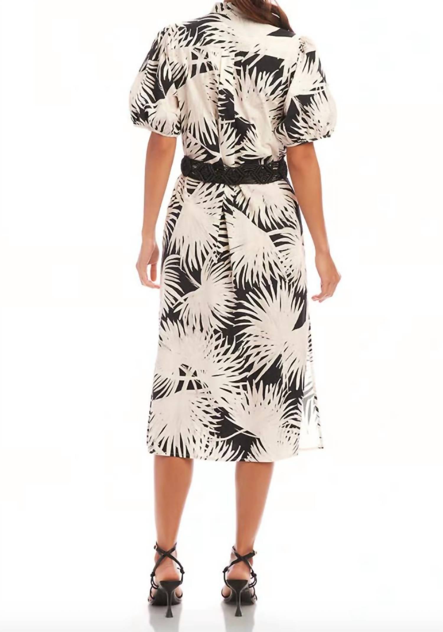 A midi dress so versatile, your options for wearing it are endless. Introducing the Karen Kane Puff Sleeve Shirt Dress, an essential for any fashionable wardrobe. With its trendy black print on off-white, this midi dress features short puff sleeves, a mandarin collar, and a versatile shirt silhouette. Crafted from 100% cotton of French origin and made in the USA, it boasts a comfortable fit with convenient side pockets and a removable braided belt for a customizable style. Closure is a button front, and the dress is easy to care for with machine wash cold and line dry instructions; length measures 48 1/8 inches for size M.