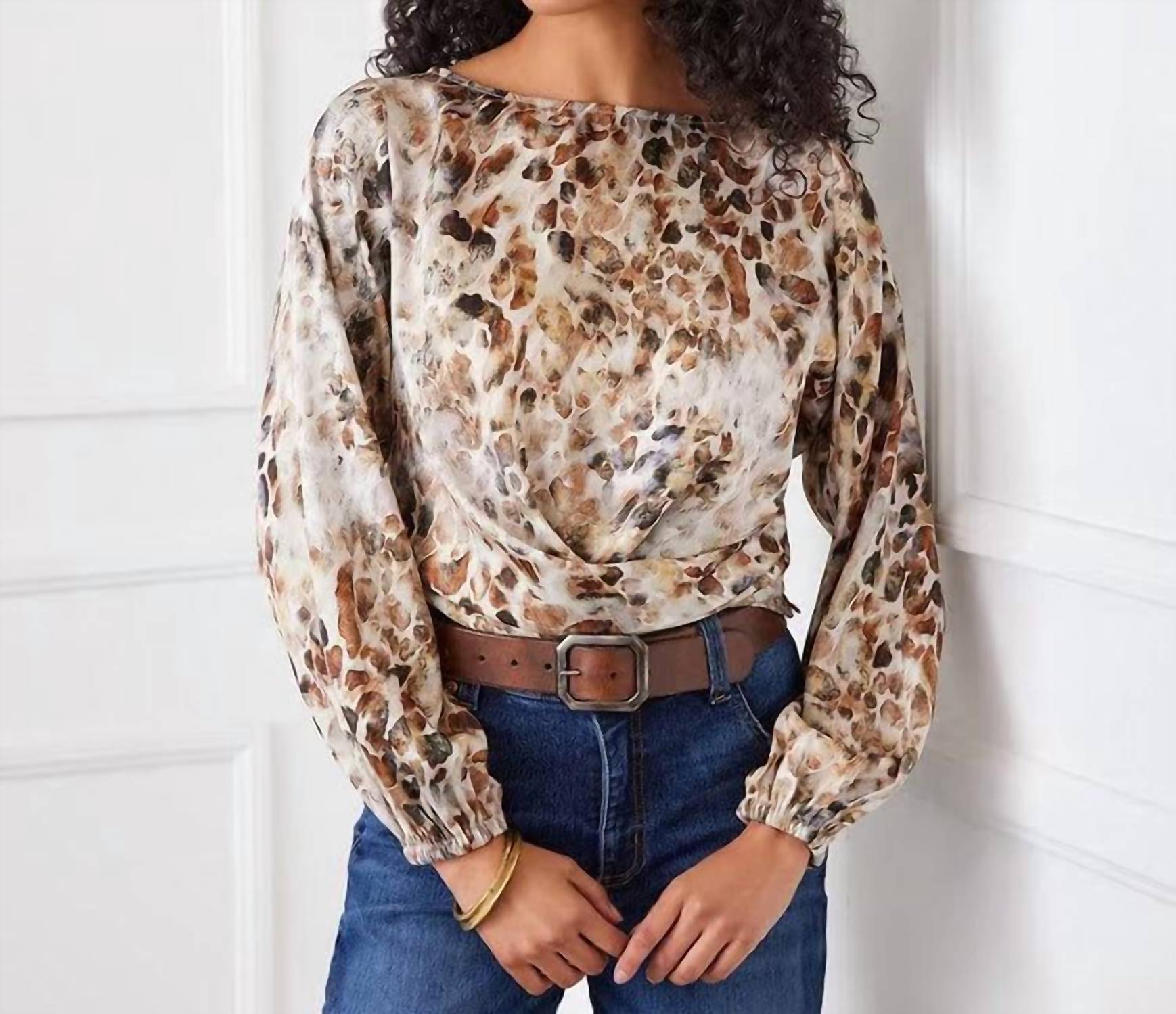 A timeless blouse that will never go out of style. Presenting the Boatneck Drape Top by Karen Kane, a sophisticated choice for women seeking quiet luxury this spring. This blouse features long bishop sleeves and a stylish boatneck neckline, crafted from 100% polyester with an abstract stone woven print. Made in the USA with Italian fabric, its elegant twist front hem and side zipper closure add a touch of sophistication to any evening event. Measuring 21.375 inches in length, this top requires hand washing and suggests hanging to dry, with the option of low heat ironing or dry cleaning.