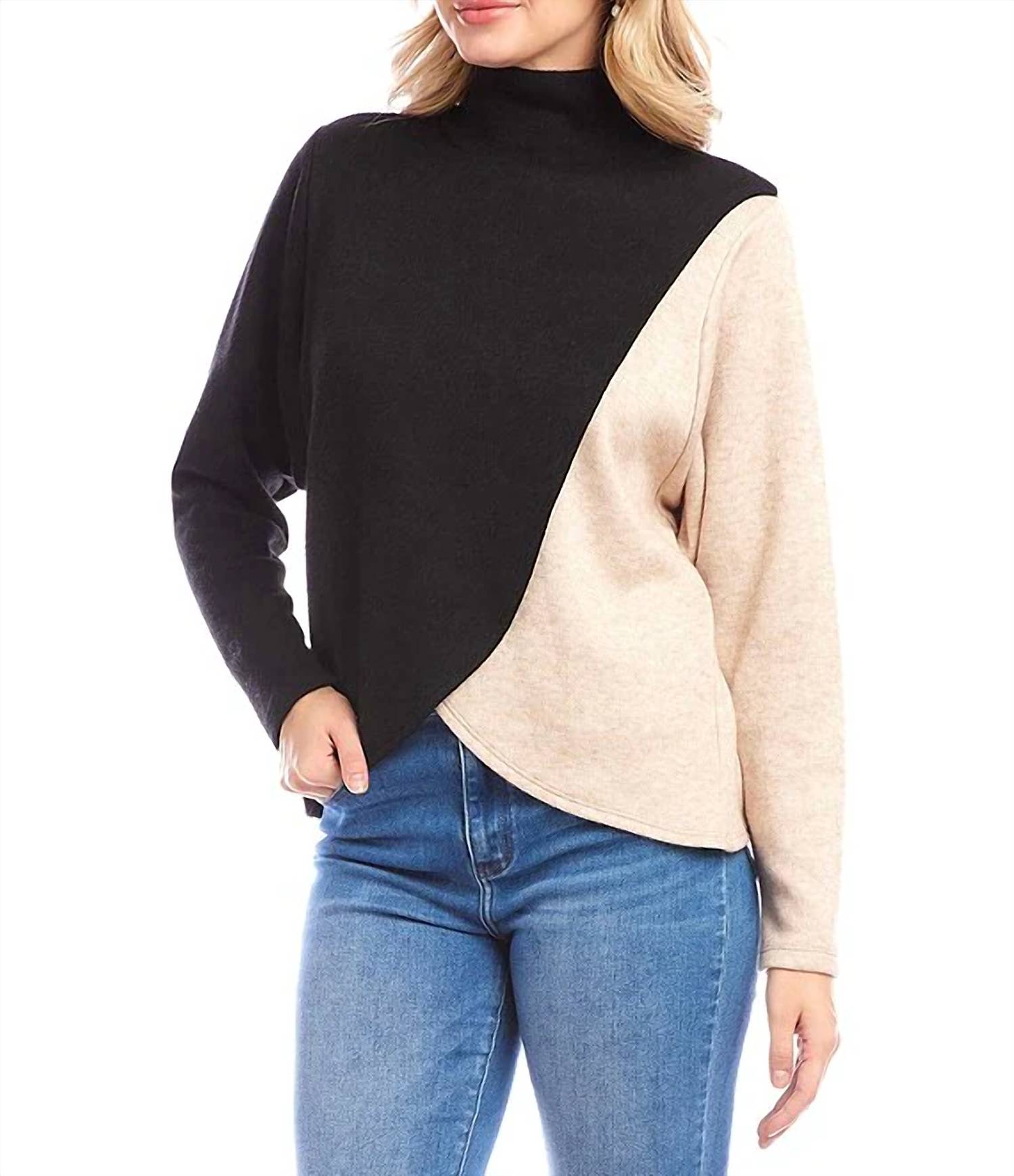 The perfect long sleeve tee that goes with just about anything. Elevate your wardrobe with the Crossover Colorblock Top by Karen Kane, a chic and contemporary choice in classic black and oatmeal hues. With long sleeves and a mock neck, this relaxed fit piece offers both comfort and style, boasting a curved crossover hemline for added flair. Crafted from a blend of rayon, polyester, and nylon, this top ensures a flattering fit and feel. Made in the USA from imported fabric, it features a pull-on construction and should be hand washed and laid flat to dry. Length: Approximately 20.25 inches.