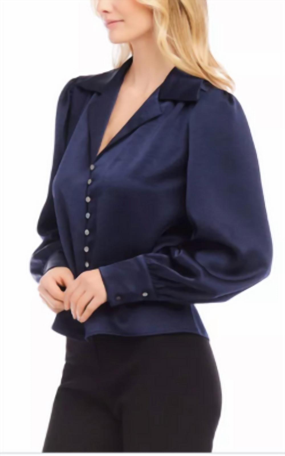 A versatile blouse that works from desk to dinner! Karen Kane Shirred Blouse features elegant puff sleeves and a soft, satin fabric. The delicate shirring adds a touch of sophistication, while the shell buttons provide a timeless finishing touch. Perfect for a professional look or a special occasion.
