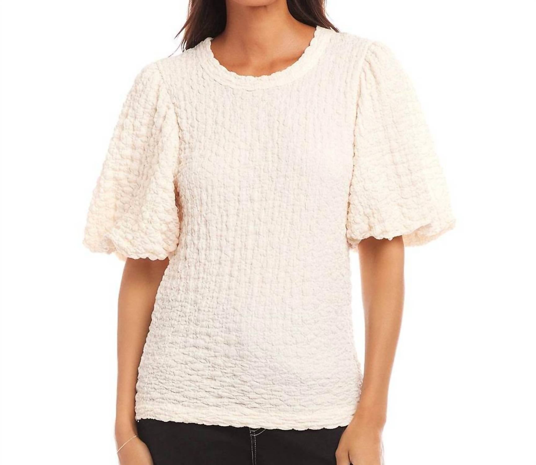 Look no further, you just found your perfect tee! Elevate your wardrobe with the Karen Kane Puff Sleeve Textured Top in cream, perfect for any occasion. This short sleeve tee features a charming bubble texture knit, composed of 98% polyester and 2% elastane, offering both style and comfort. The pullover top, with a length of 23 1/8 inches in size M, is imported and designed with a flattering crewneck and puff sleeves. Care for it easily by machine washing cold and laying flat to dry.