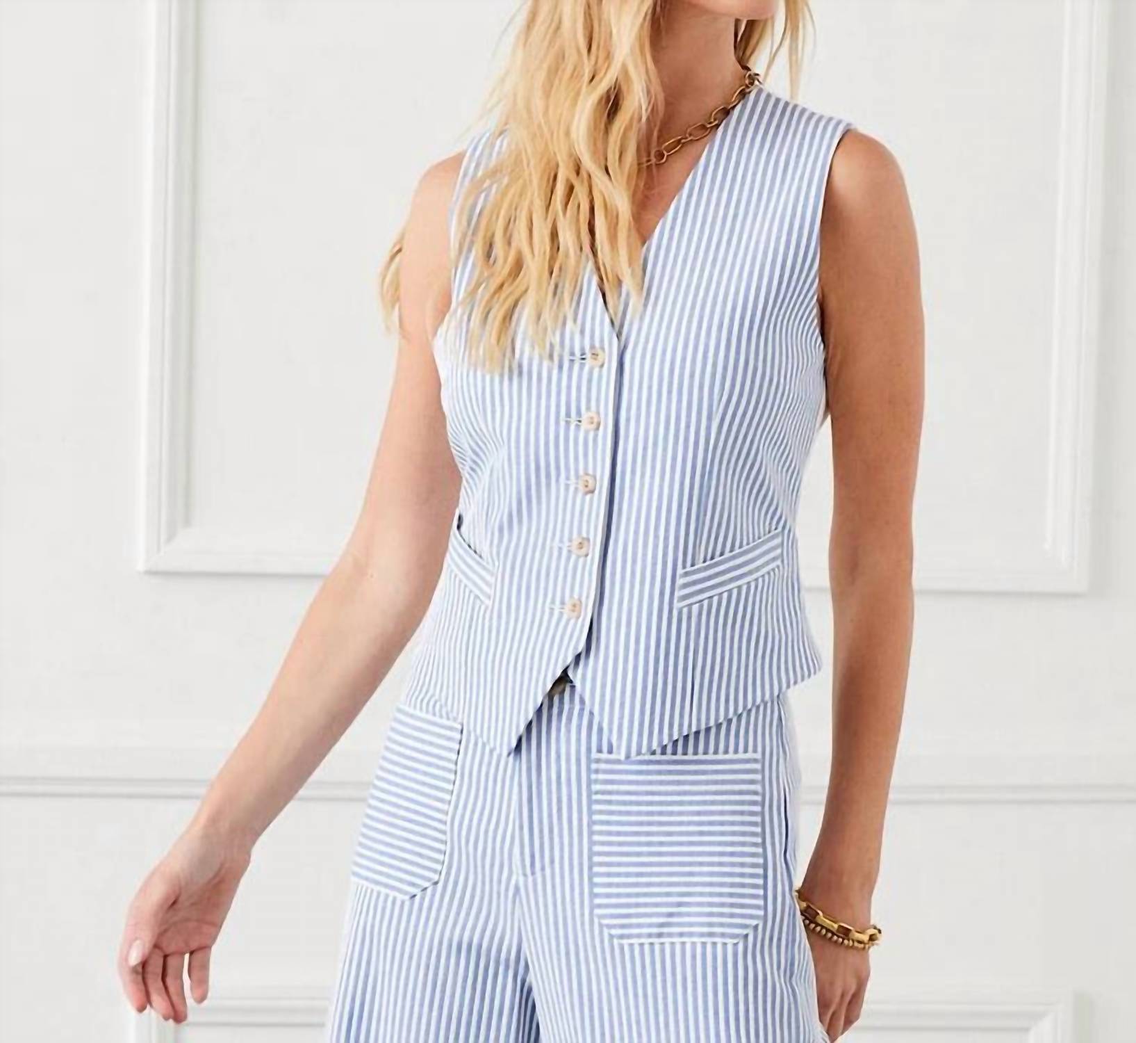 A vest so versatile you can mix and match it with almost any outfit and it will feel brand new every time. Elevate your summer wardrobe with the Stripe Button-Up Vest by Karen Kane, tailored for a chic feminine fit. This sleeveless vest is crafted from a cotton blend with elegant blue and off-white stripes, featuring a fitted bust and waist. The garment is 22 5/8 inches in length and is completed with front tortoiseshell button closures and stylish back waist ties. Originating from imported fabrics, it offers ease of care with machine wash cold on a delicate cycle and tumble dry low.