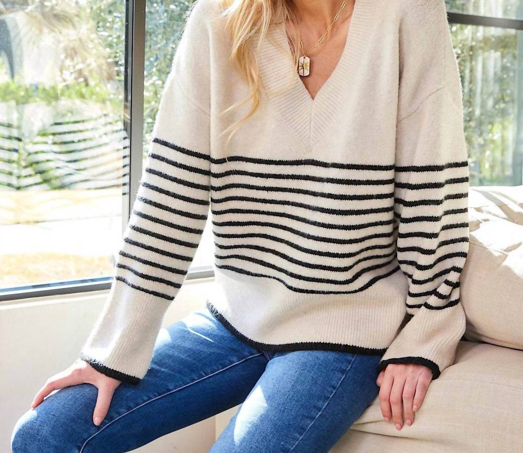 Wear this v-neck sweater with your favorite denim for the perfect fall look. The Stripe V-Neck Sweater by Karen Kane offers a timeless look with its flattering V-neckline and classic horizontal black stripes against an ecru backdrop. It features long drop shoulder sleeves made from 69% Acrylic, 28% Polyester, and 3% Spandex, ensuring a relaxed and comfortable fit. Designed with a garment length of 23.5 inches for size M, this imported sweater comes with a convenient pull-on closure. Care instructions are to hand wash cold and lay flat to dry or opt for dry cleaning.