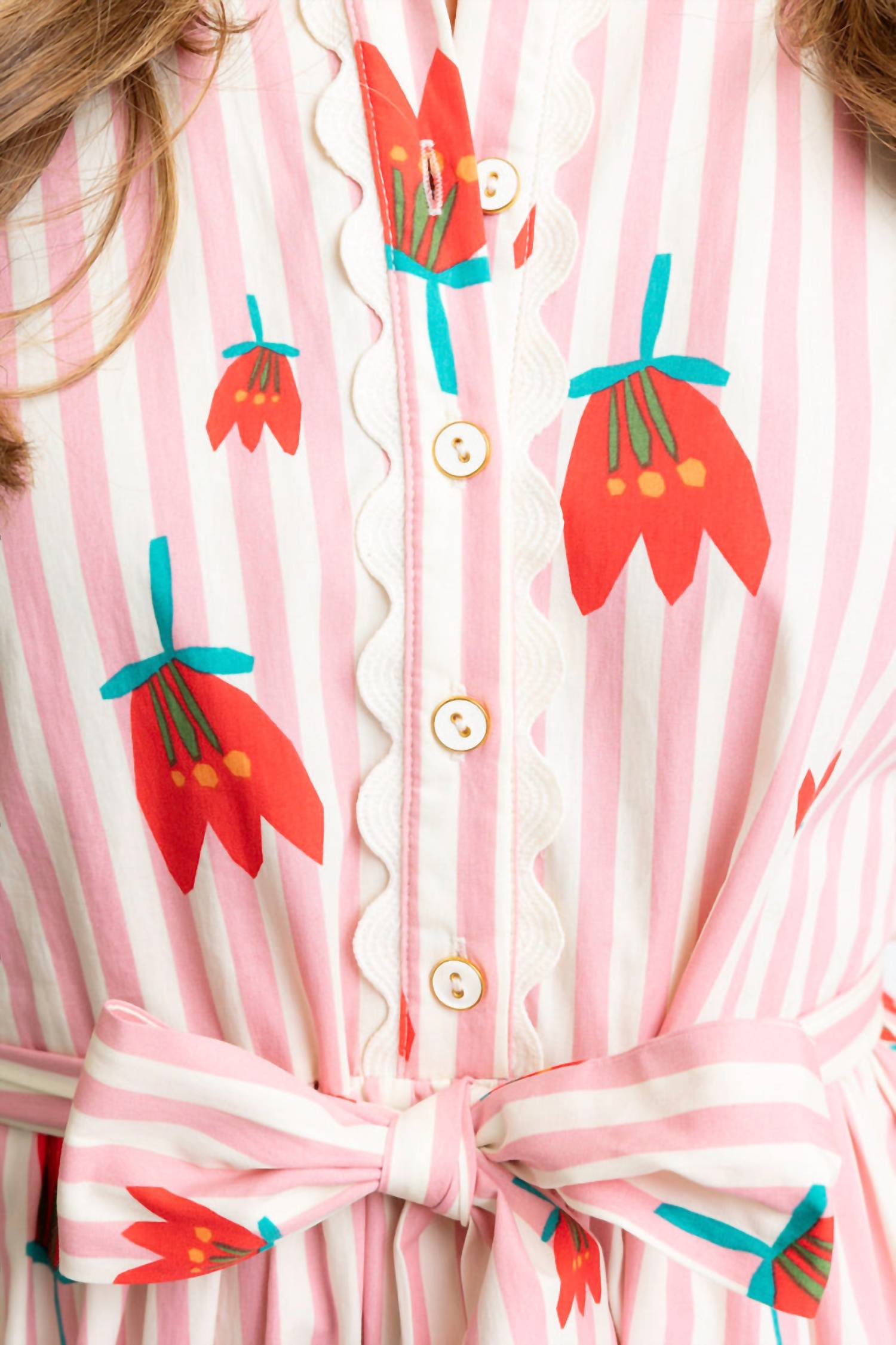 A maxi dress that is just as cute as it is comfortable. Introducing the Stripe Poppy Maxi Dress by Karlie, a vibrant must-have for your spring wardrobe. This charming dress features cap sleeves and a colorful pink stripe pattern with a striking red poppy print. The button closure adds convenience, and an optional tie belt offers versatile styling options. Crafted for women with a practical addition of pockets, care is simple with dry cleaning recommended. 100% cotton.