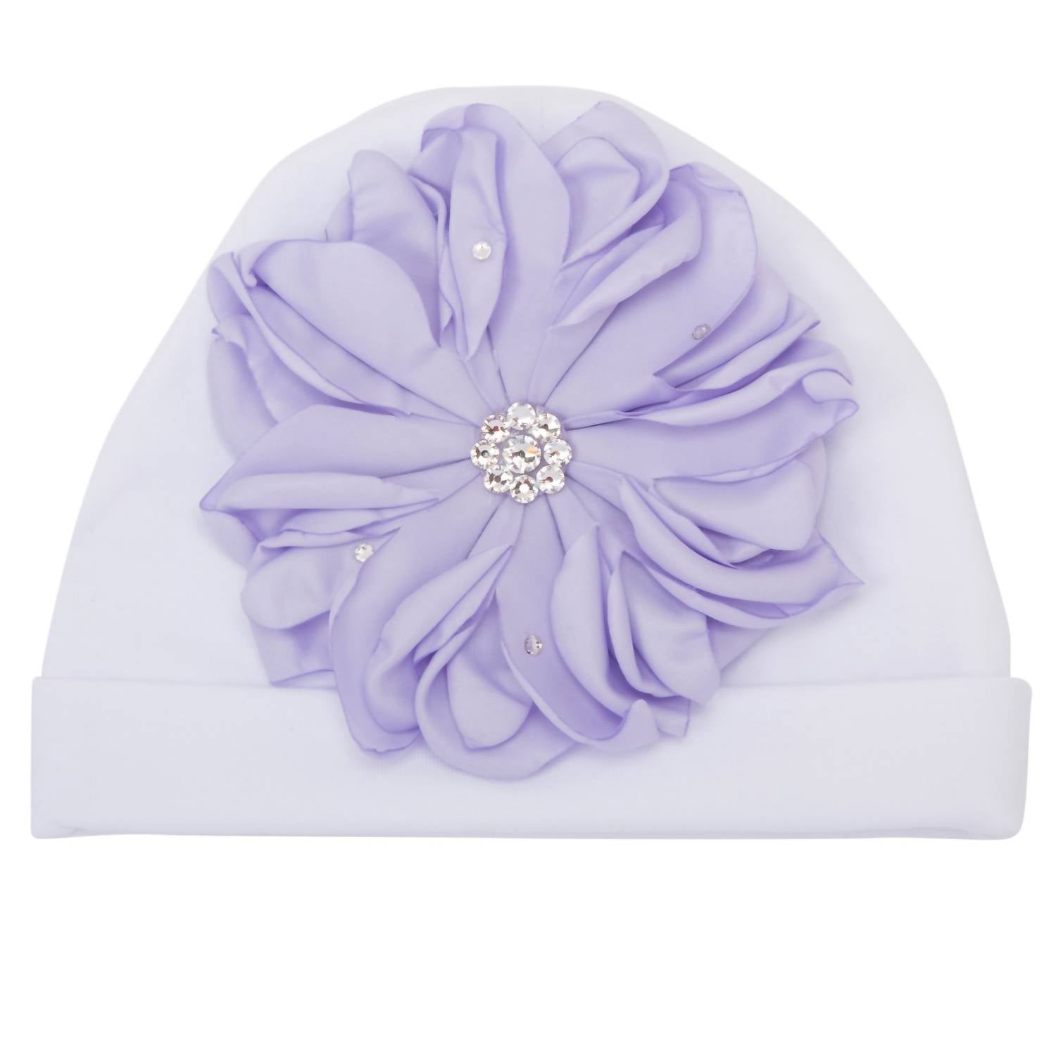 Introducing the Baby Chloe Hat by Bari Lynn, a charming accessory crafted from 100% white cotton. This hat features a striking lilac silk floral accent adorned with a cluster of sparkling stones at the center, with single stones embellishing some petals. Designed to grow with your child, it can be worn with or without a rolled flap for versatile styling over several months. A delightful addition to any little one's wardrobe, this hat promises both comfort and style.