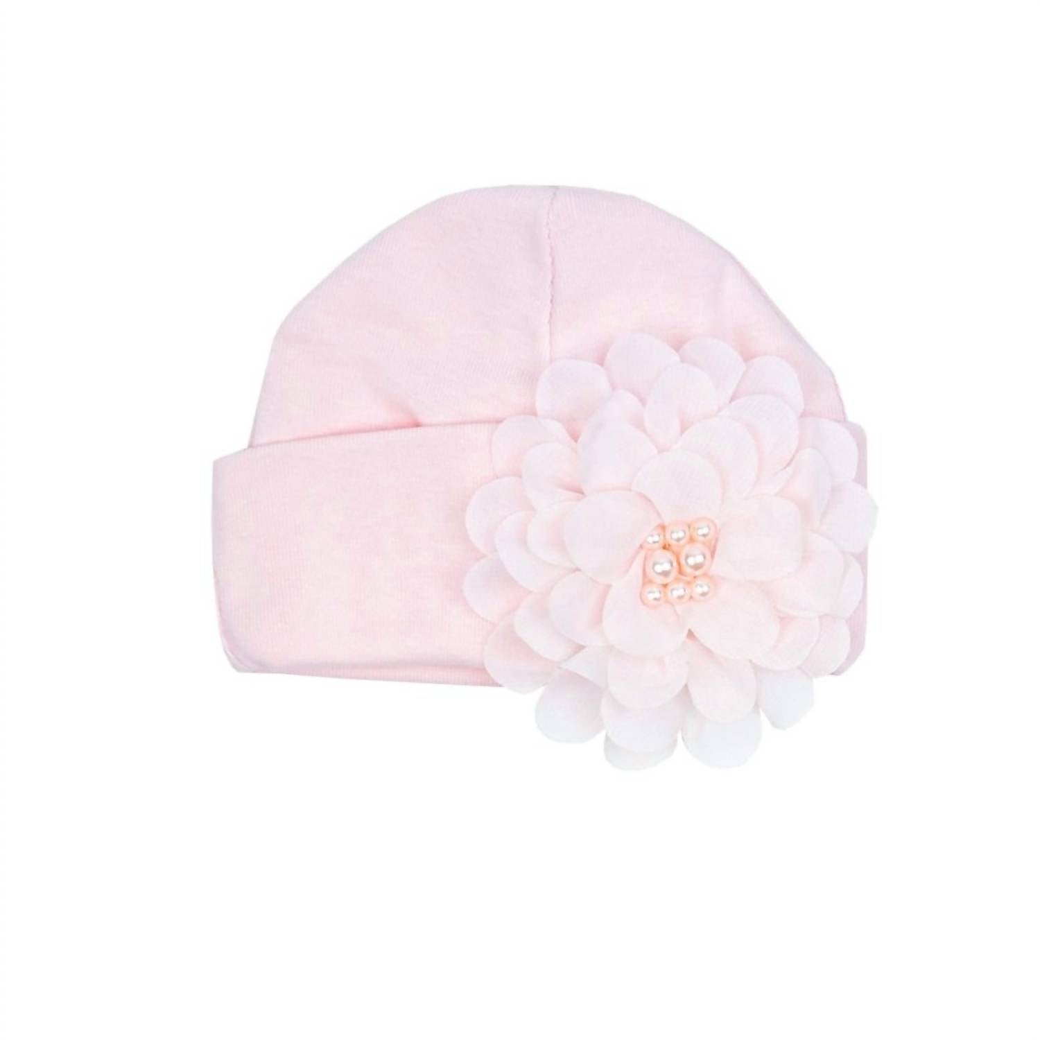 The Newborn Chic Petit Cap by Haute Baby is the perfect complement to the matching "Chic Petit" gown and blanket. Crafted in lovely pink, this hat is made of 100% cotton and features an elegant floral accent with a pink pearl center. Lovingly made in the USA, this cap is a charming addition to your newborn's ensemble.
