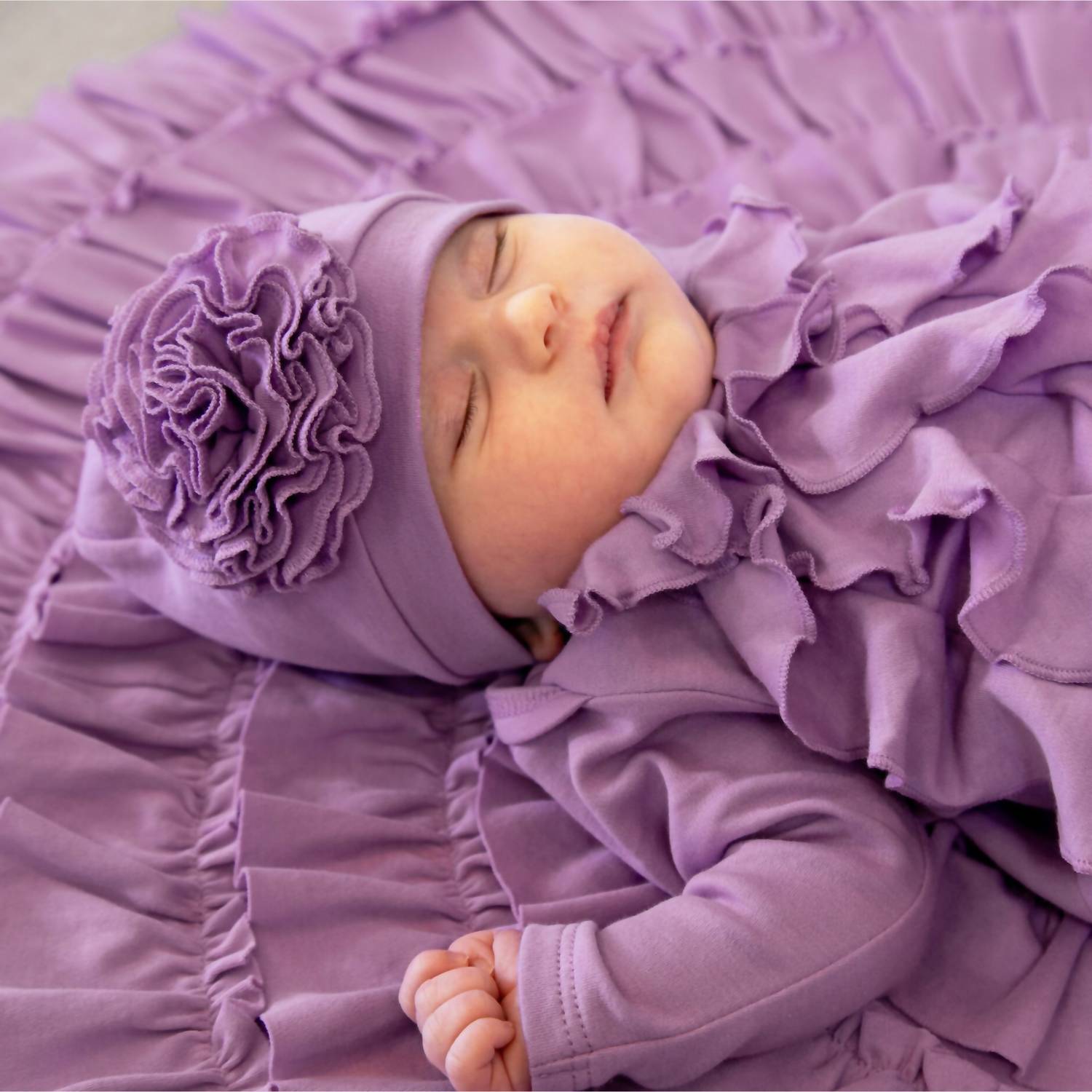 Isn't this the cutest little baby hat from Lemon Loves Layette? The "Bijou" hat in amethyst is the perfect little accessory that coordinates beautifully with the amethyst fashions in sizes 0-3 mos. and 3-6 mos. Just perfect to complete a precious "Take Me Home" set when paired with the Jenna newborn gown. Keep her warm and comfy when paired with her Olivia, Peony and/or Sophia rompers, too. Just perfect for when she's out for the day in the cooler months ahead. It's 100% cotton and features an adorable amethyst flower front and center. A great baby shower gift and perfect for baby's first photo op, too. The Bijou hat is a great choice if you prefer something other than a headband.