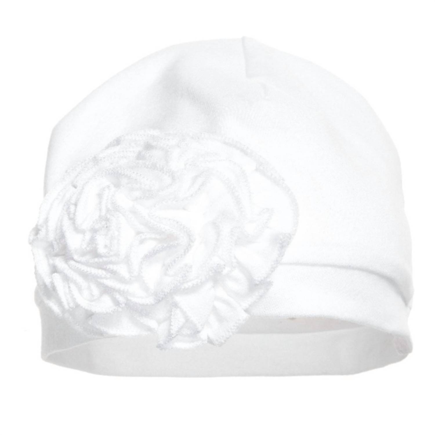 The perfect little baby hat from Lemon Loves Layette. The "Bijou" hat in white is the perfect little accessory that coordinates beautifully with all Lemon Loves Layette Olivia and Peony rompers and Madison onesies. Many moms prefer a little hat to keep their newborns warm. It's 100% cotton and features an adorable white flower front and center. Our model is wearing the Madison Onesies with the hat. It's great for Christening or After Christening as well. A great baby shower gift and perfect for baby's first photo op too.
