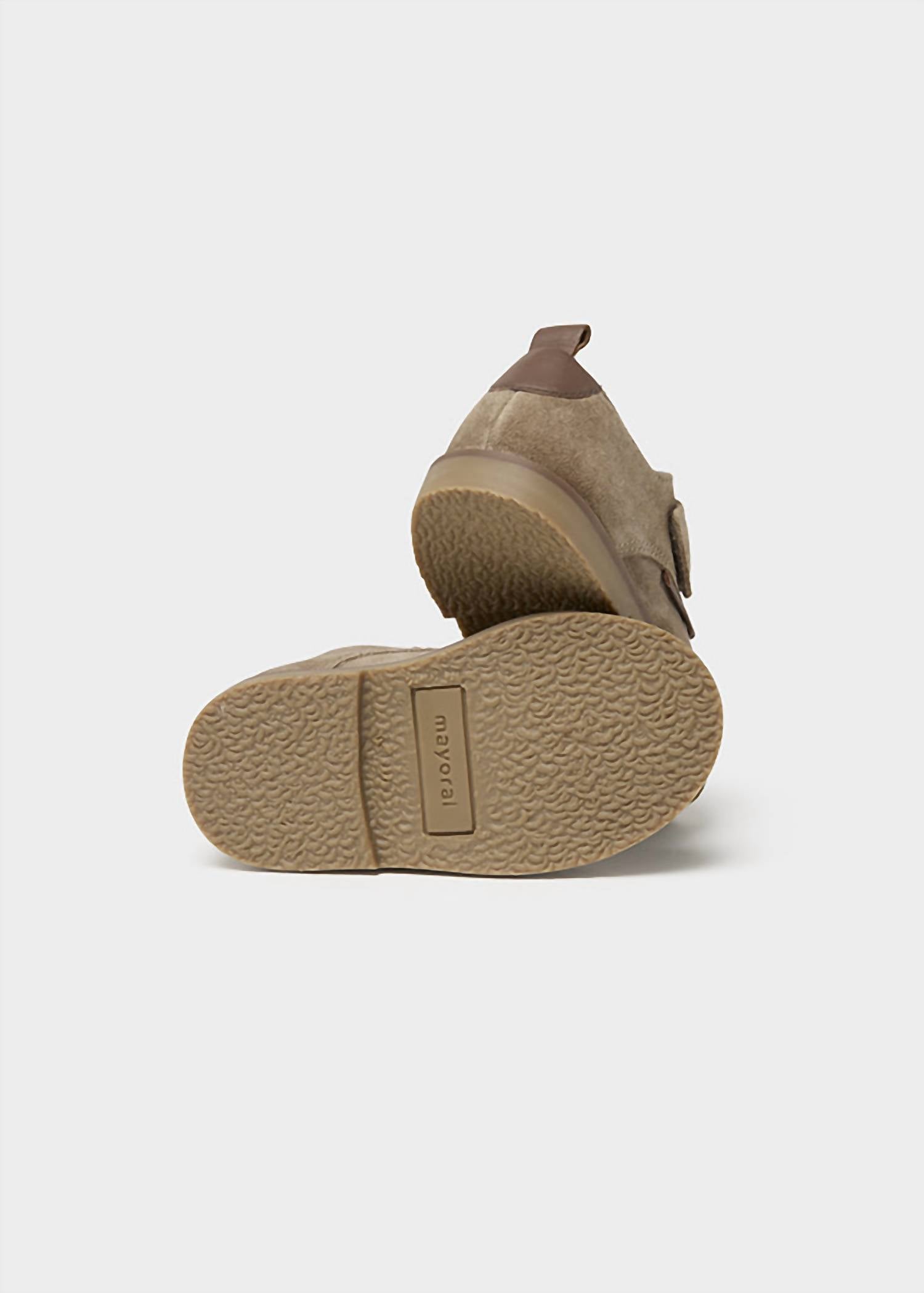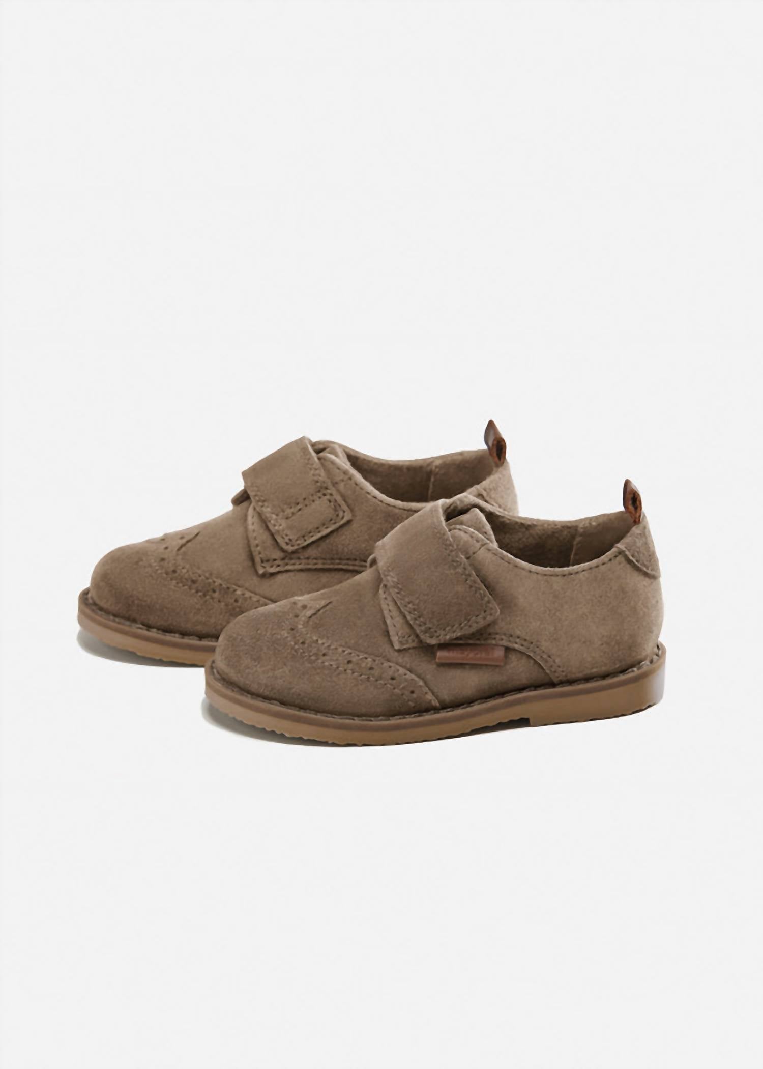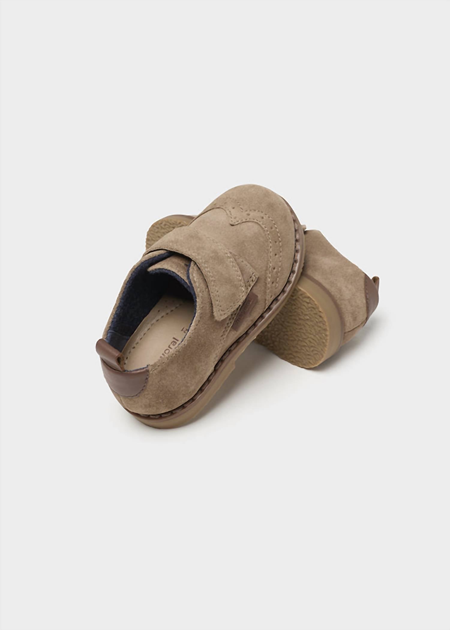 Introducing the Velcro Oxford by Mayoral, a stylish and practical choice for toddlers. These taupe suede boots feature an adjustable over-the-foot strap for a snug fit, with a convenient pull tab for easy slip-on access. Designed with a round toe and medium width, they ensure comfort and mobility. Perfect for both holiday parties and streetwear, these boots with a flat heel are crafted to keep your little one ready for summer adventures.