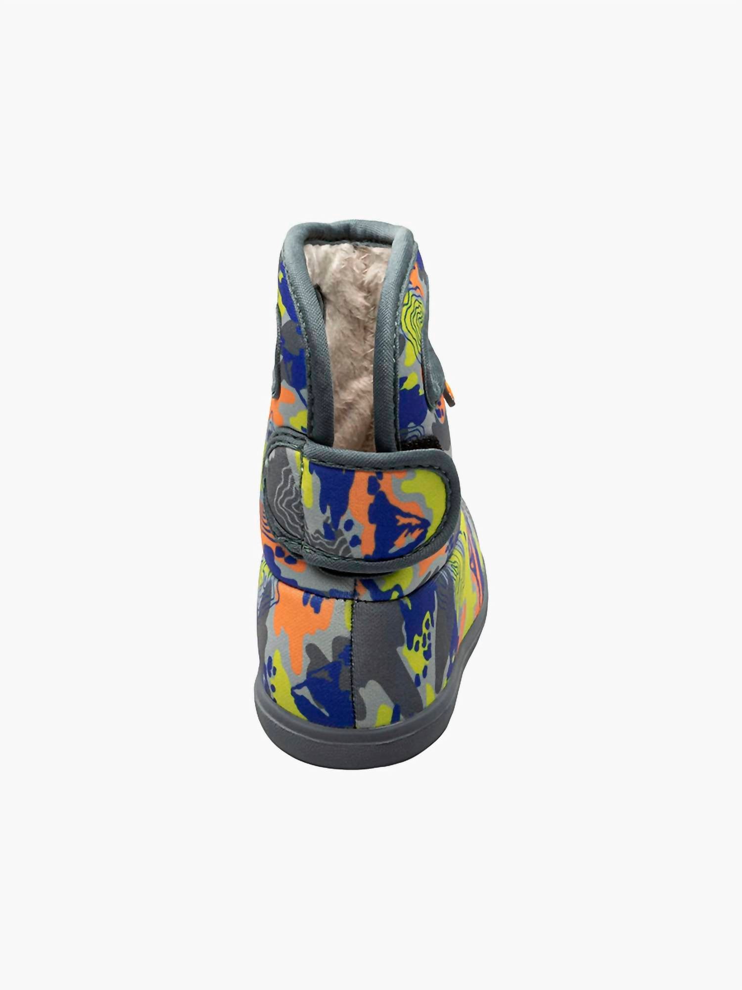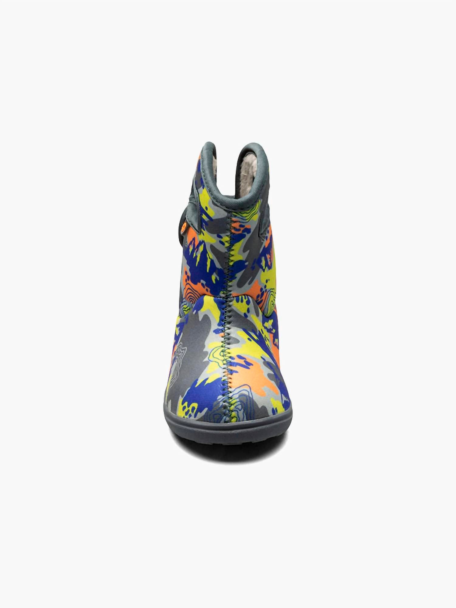 Introducing the Baby Bogs Topo Camo Boots by BOGS, perfect for young walkers with their easy-to-use handles and velcro straps. These multi-colored boots are 100% waterproof, made with 3mm Neo-Tech waterproof insulation to keep little feet comfortable and dry. Built with a fully vegan, round toe design, they feature an eco-friendly algae-based EVA footbed and BOGS Max-Wick technology to evaporate sweat. Ideal for chilly weather, they're comfort rated to 14°F/-10°C and can be conveniently machine washed to maintain freshness.