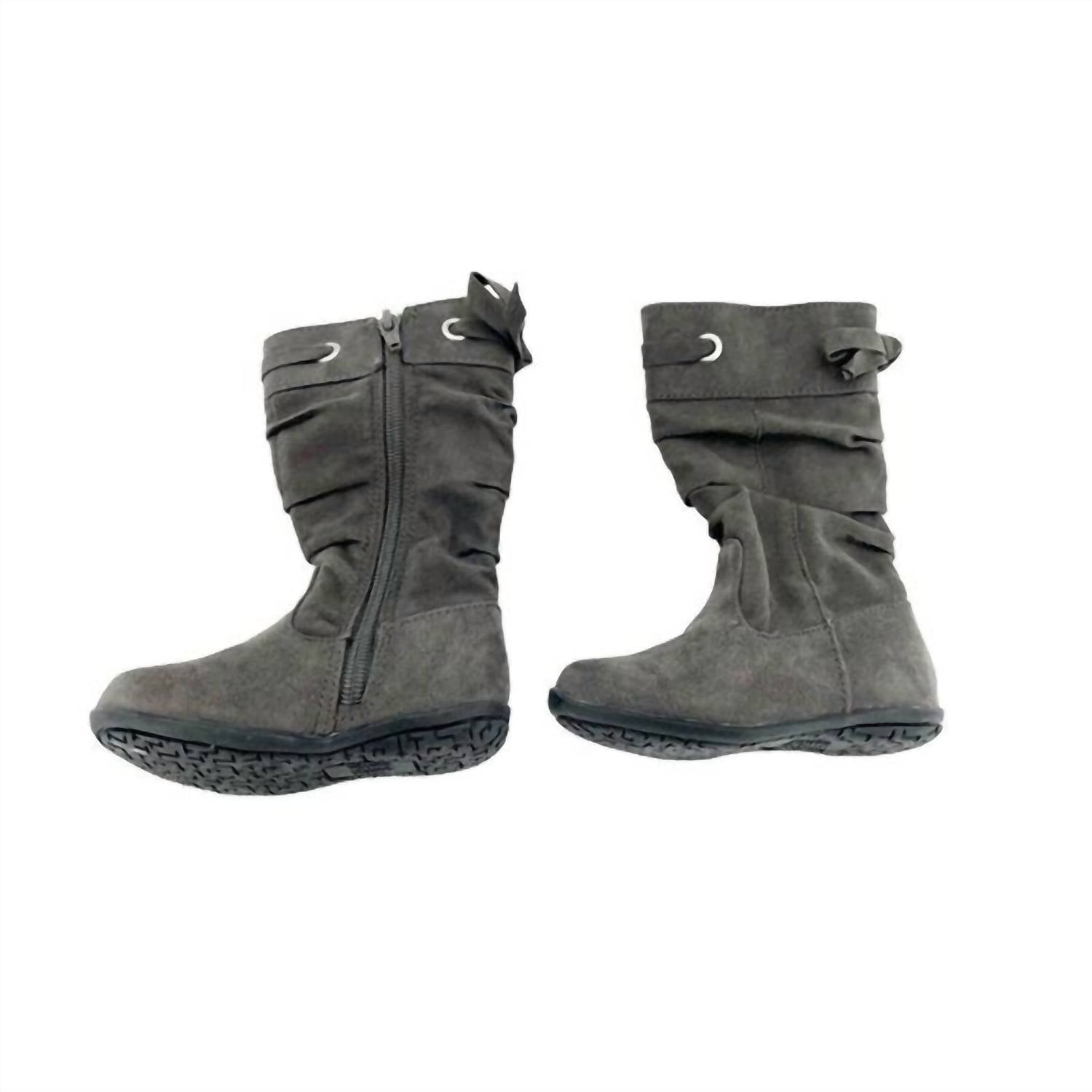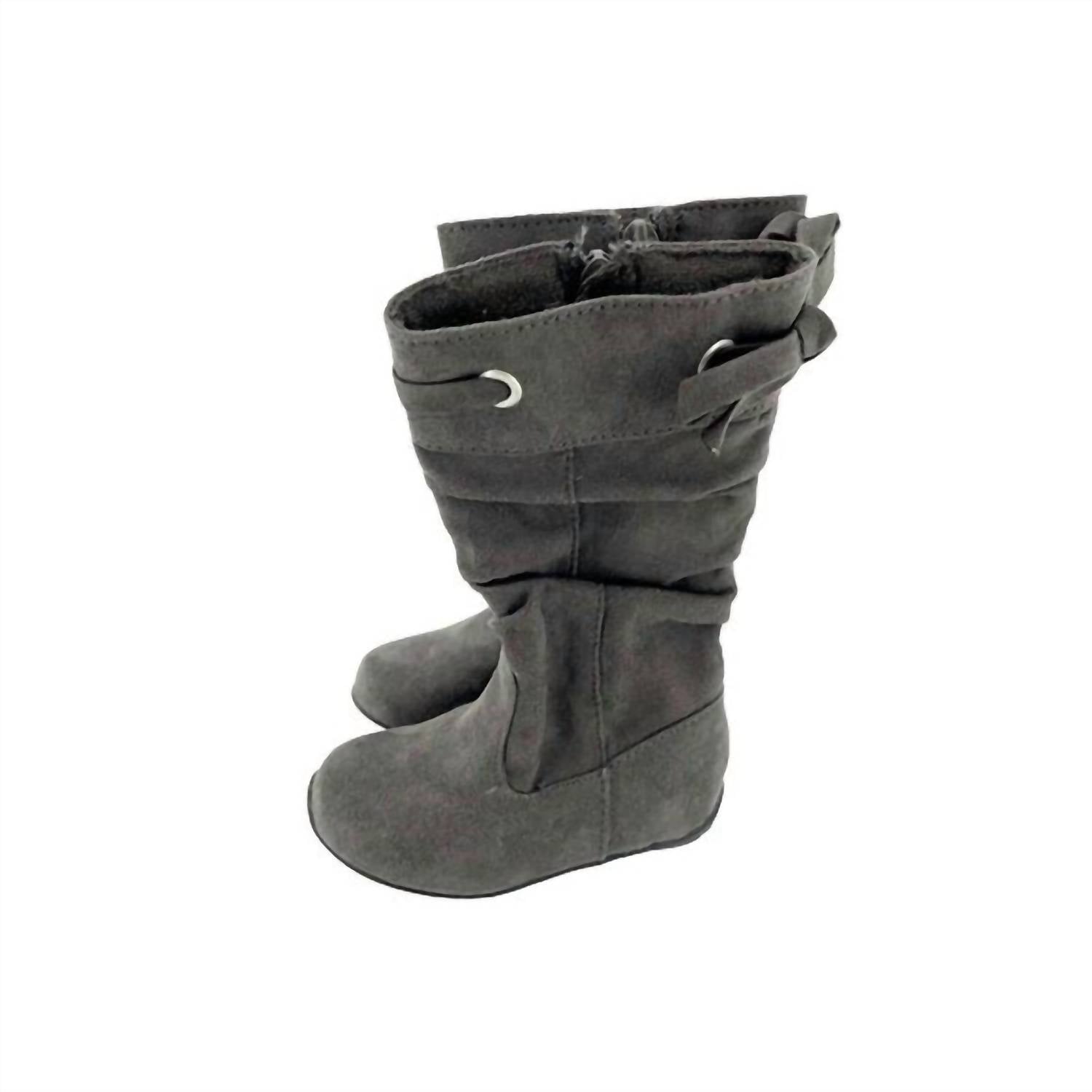 Round toe Faux suede construction Ruched shaft Lace-and-grommet detail Side zip closure Lightly padded footbed Fabric upper, manmade sole Boot height 7 inches