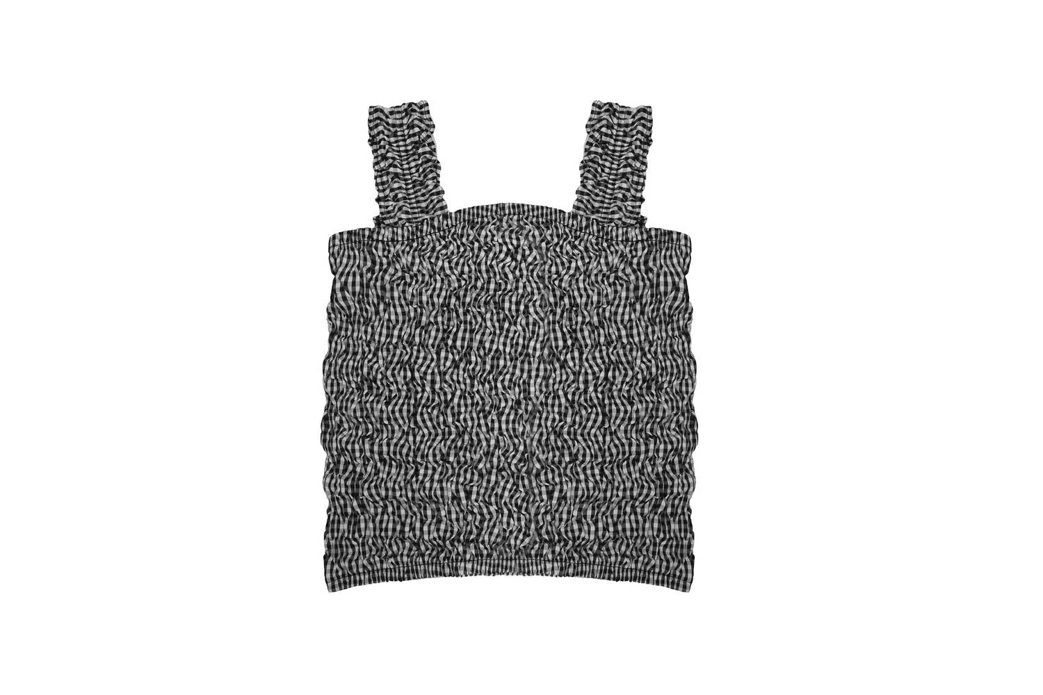 Introducing the Gingham Top by MIA, a fashion-forward piece perfect for spring getaways and Thanksgiving gatherings. This sleeveless gingham design comes in a monochromatic black and white, featuring a wide ruffle strap and a smocked, fitted body for ultimate comfort. Made from 100% Polyester, this top is lightweight and stretchy, ideal for a summer picnic or vacation. Care: Turn inside out, hand wash cold separately, line dry, and cool iron if needed, but do not iron decoration.