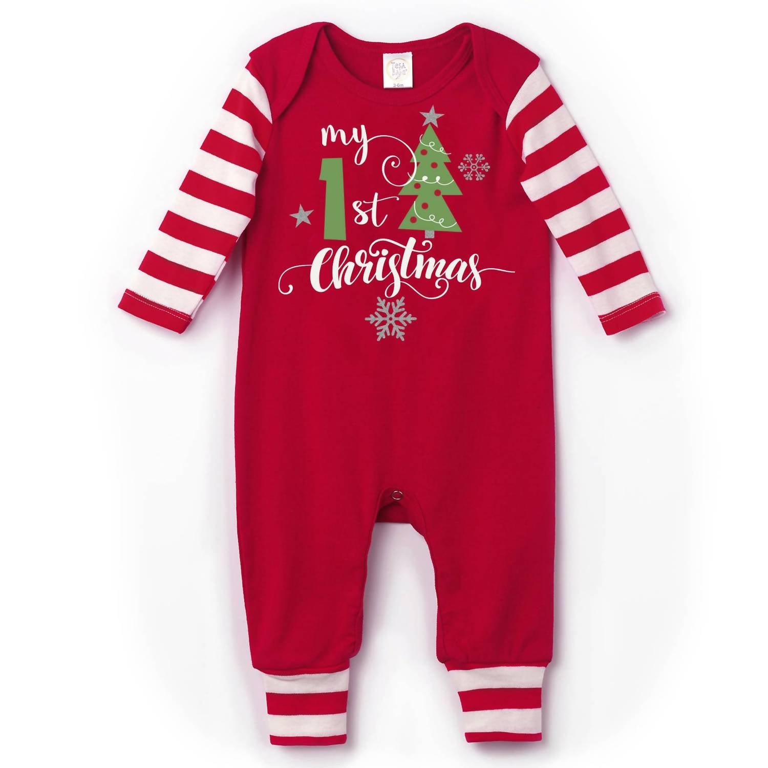 Vibrant red romper featuring "My 1st Christmas" graphic with a festive Christmas tree, snowflakes, and stars. Contrasting red and white striped long sleeves. Snap closure at the legs. Striped ribbed cuffs.
