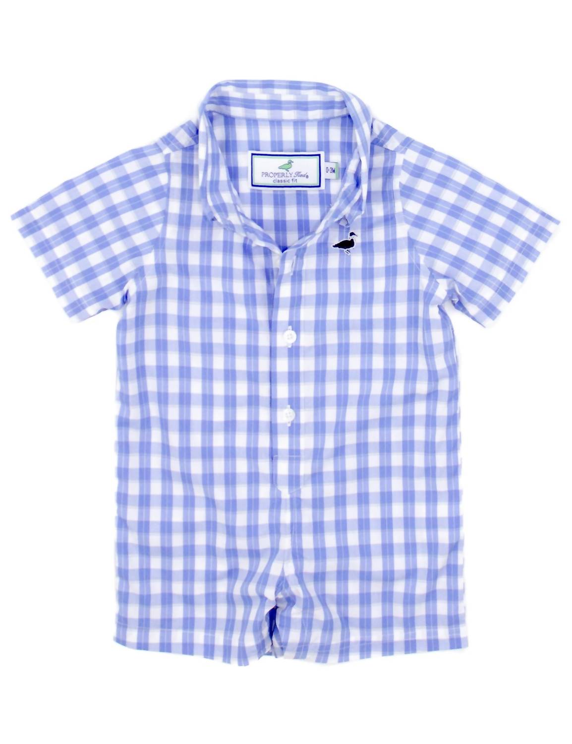 Introducing the Properly Tied Boys Spring Seasonal Shortall in a delightful Clearwater shade, perfect for a minimalist spring dinner party. This gingham-patterned overall is designed to keep your little one stylishly comfortable throughout the season. Care instructions emphasize easy maintenance with a hand wash and line dry approach. Ideal for creating adorable, memorable moments.
