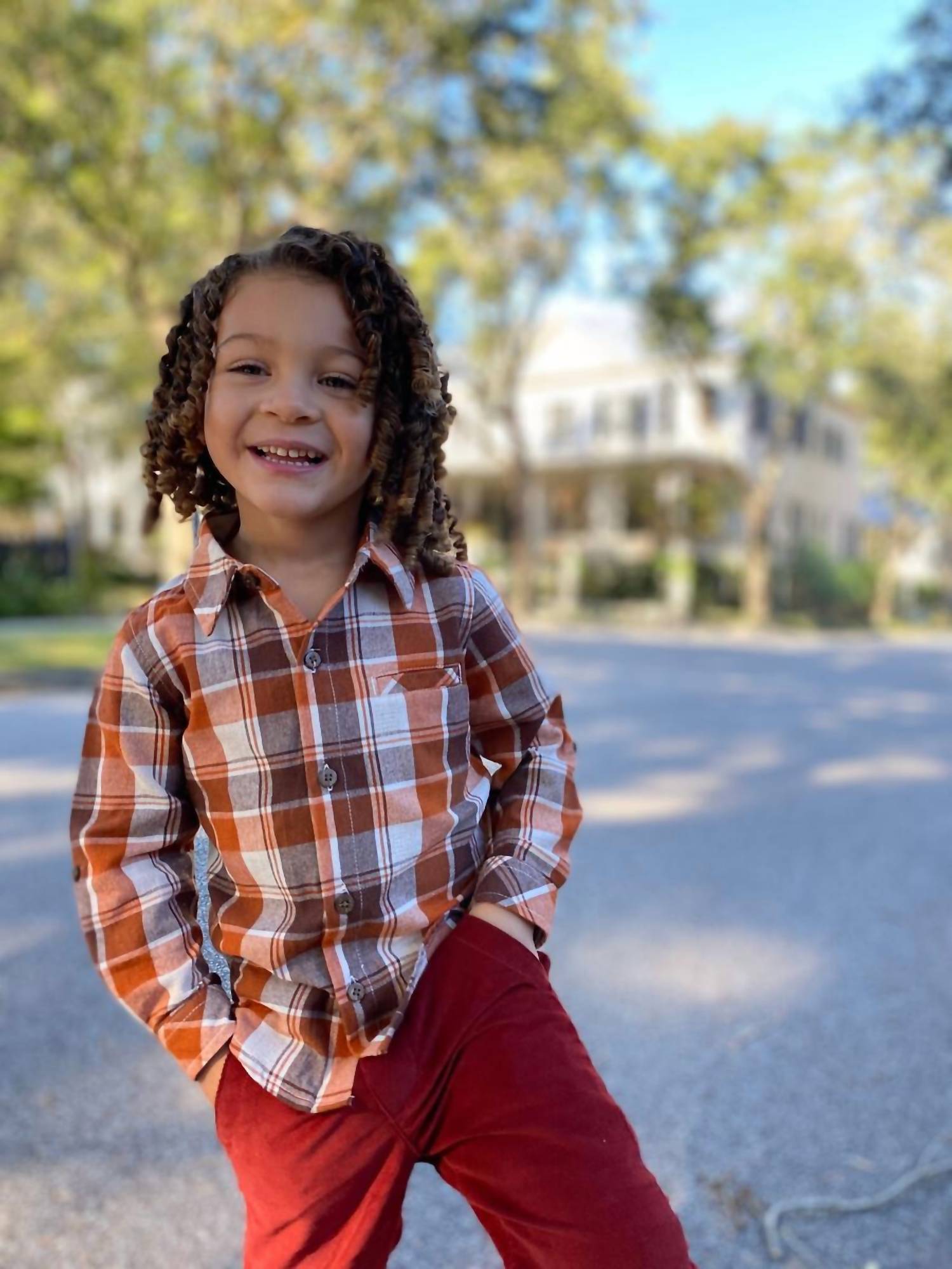 Meet the Boys' Atwood Woven Shirt by ME & HENRY, a stylish choice in a rust plaid that's perfect for vacation outings. This long sleeve shirt features a front button-down closure with a rustic touch of wooden-look buttons, adding a unique charm. Made from 100% cotton with a textured body, it includes practical features like a welt pocket on the chest, a curved bottom hem, and cuffs with a single button for easy roll-up. Care: Machine wash cold, do not bleach, hang dry, and medium iron for a polished look.