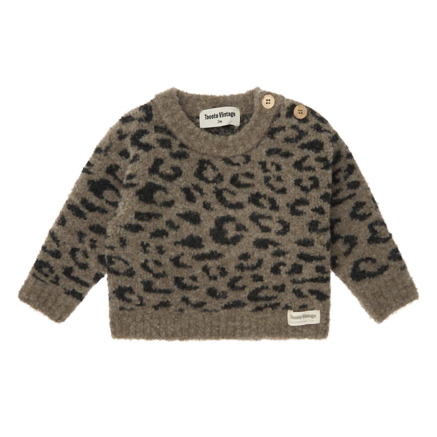 The Animal Print Sweater by Tocoto Vintage is a charming brown baby sweater featuring a playful animal print. This piece has long sleeves and a round neck, with convenient button closures on the shoulder. Its composition includes 45% Acrylic, 27% Polyamide, 17% Viscose, 10% Wool, and 1% Elastane, offering warmth and comfort.