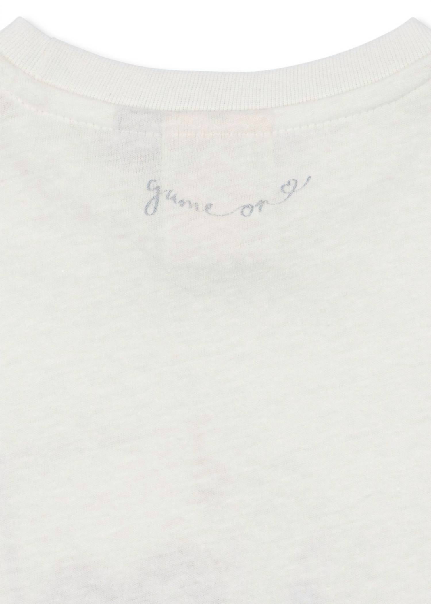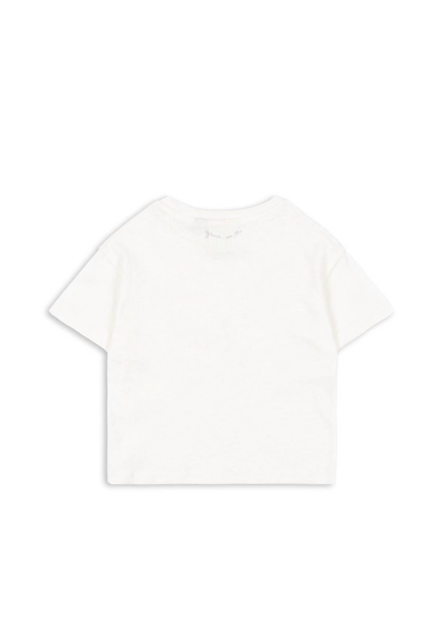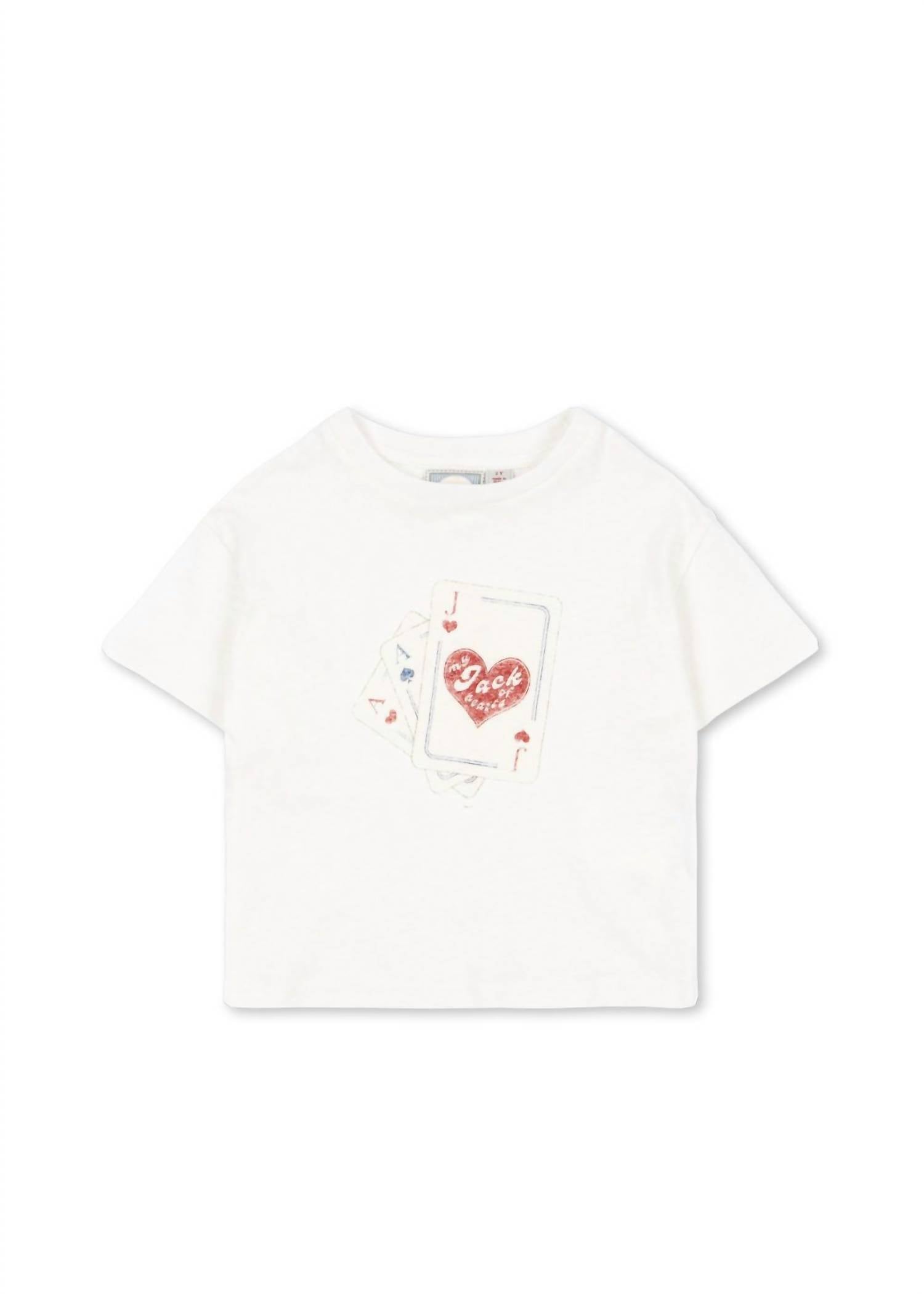 Introducing the Kids Jack Top by Konges Sløjd, a stylish and comfortable piece crafted with a breathable linen blend featuring short sleeves. Designed with dropped shoulders, this classic crewneck tee is adorned with a charming 'Jack of Hearts' print, adding a playful touch dedicated to Rosie's son. Composition: 70% Organic Cotton, 30% Linen. Made in Turkey. Care: Machine wash. An excellent choice for summer vacation streetwear.
