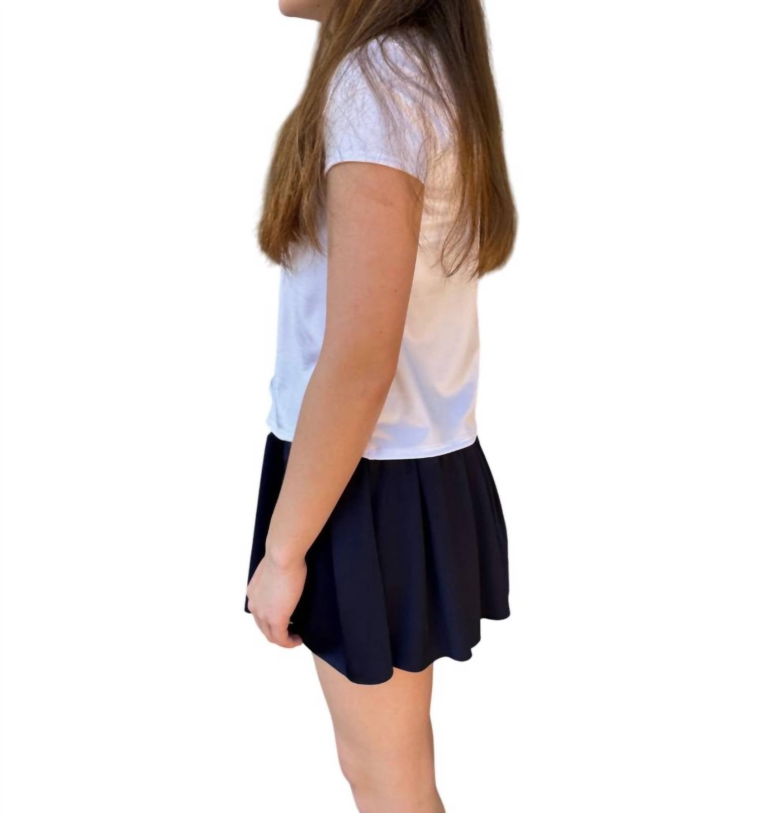 Introducing the Girls Pleated Yoga Skort by Erge Designs, a perfect blend of comfort and style in a versatile navy hue. This skort features a flattering pleated design with built-in shorts for added convenience. Composition: 95% Rayon, 5% Spandex. Care: Machine washable, making it easy to maintain.