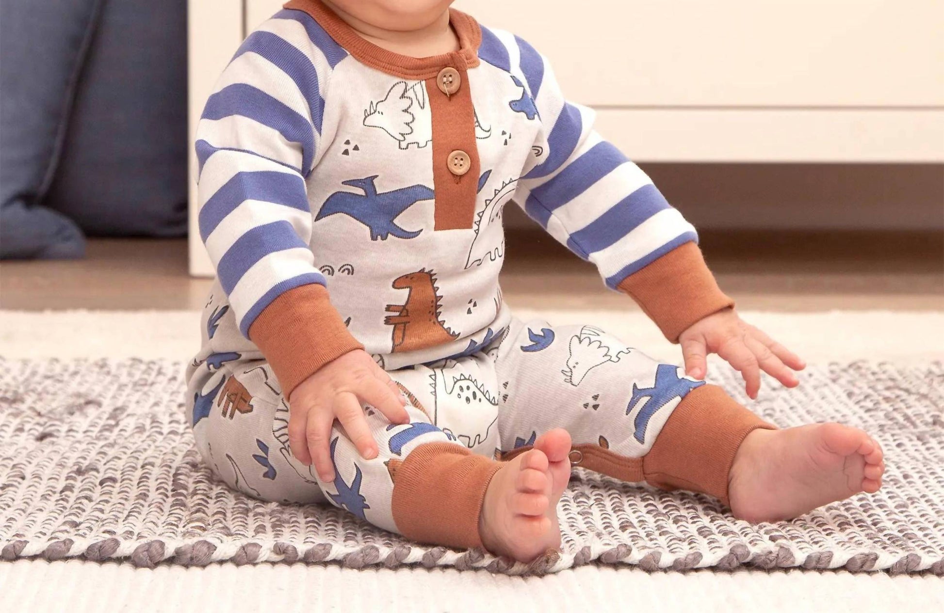 Long-sleeve romper with dinosaur and striped sleeve pattern. Henley neckline with two functional wooden buttons. Ribbed neckline, cuffs, and hem in contrasting rust color. Striped sleeves in white and blue. Snap closures at the inseam. Relaxed fit.
