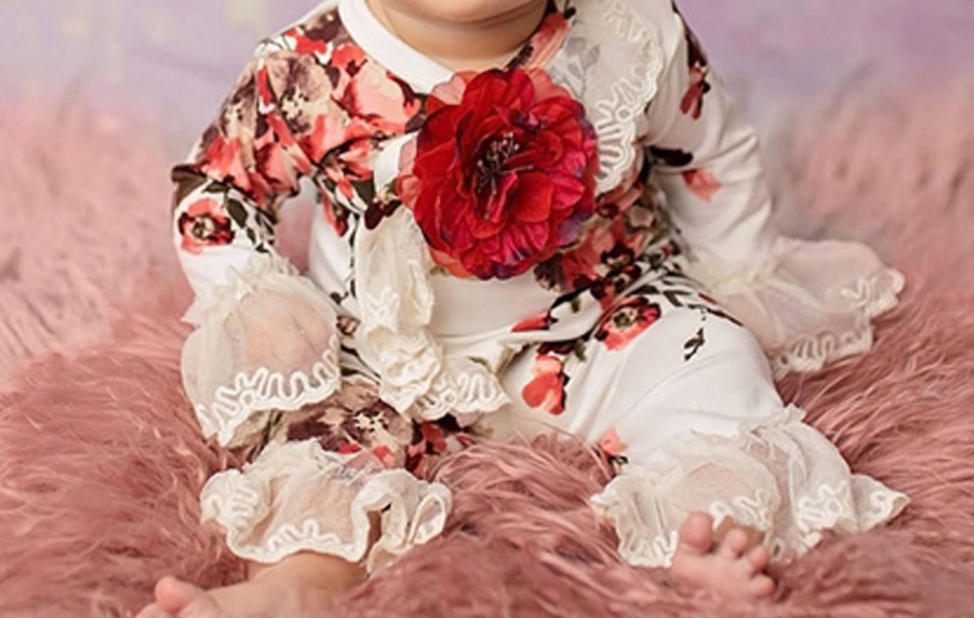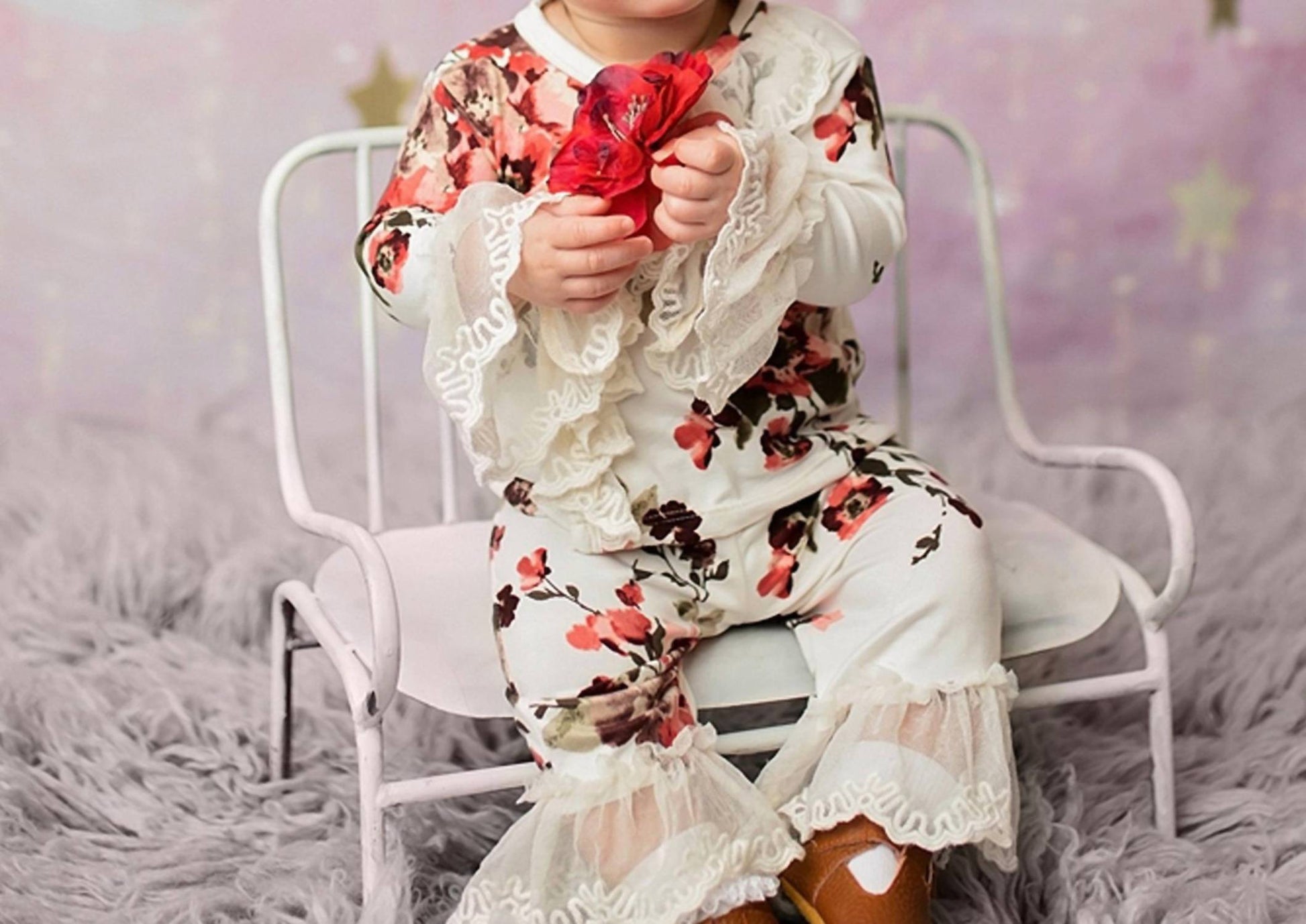 The Haute Baby "Antique Charm" Kimono Style 2pc Set in White and Red is a delightful choice for any occasion. This beautiful outfit includes a top with a charming crossover bodice, adorned with sheer vintage lace and a striking removable red flower. The matching pull-up pants also feature lace accents at the ankles, completing this elegant look. Made from soft polyester and crafted in the US, this set promises comfort and style for your little one.