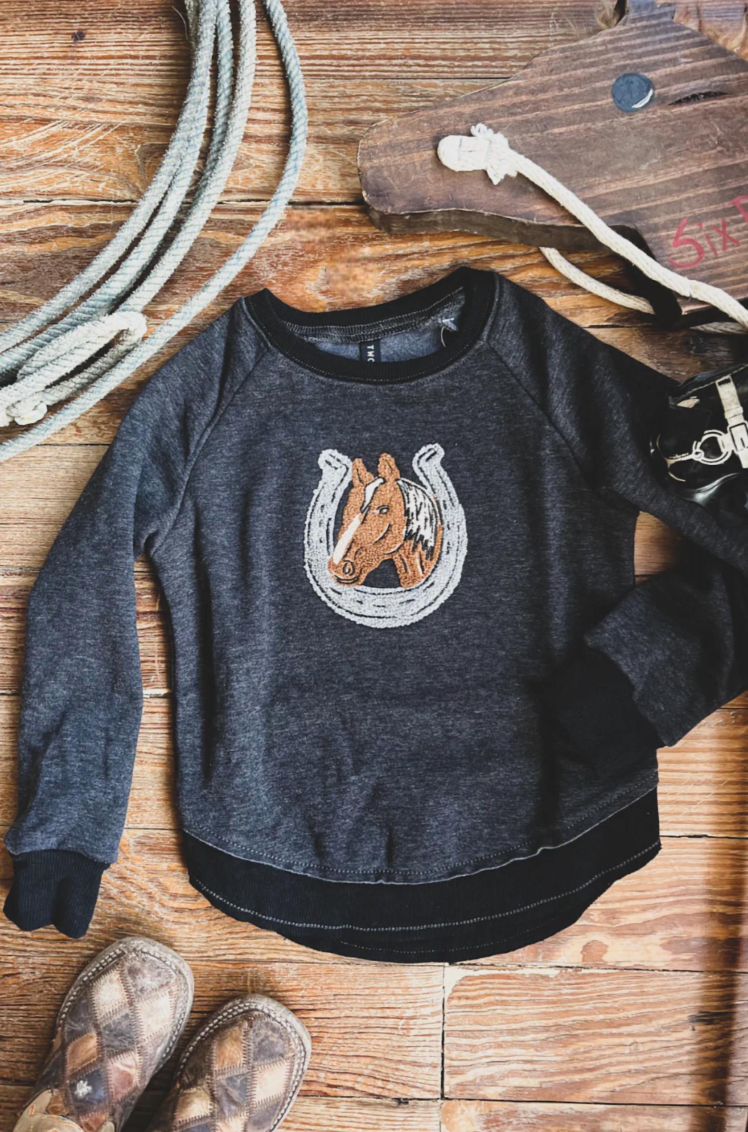 The 2 Fly Kid's Good Ol Days Long Sleeve Tee is a high-quality, stretchy pullover made from 75% polyester, 20% cotton, and 5% spandex. It features an embroidered horse and shoe patch on the front and is available in sizes 1T, 4, 6, and 10. Measurements: 1T [Length: 15", Chest: 12", Sleeve Length: 15.5"]. 4 [Length: 18", Chest: 14", Sleeve Length: 18.5"]. 6 [Length: 19", Chest: 15", Sleeve Length: 20"]. 10 [Length: 23", Chest: 17", Sleeve Length: 23"].