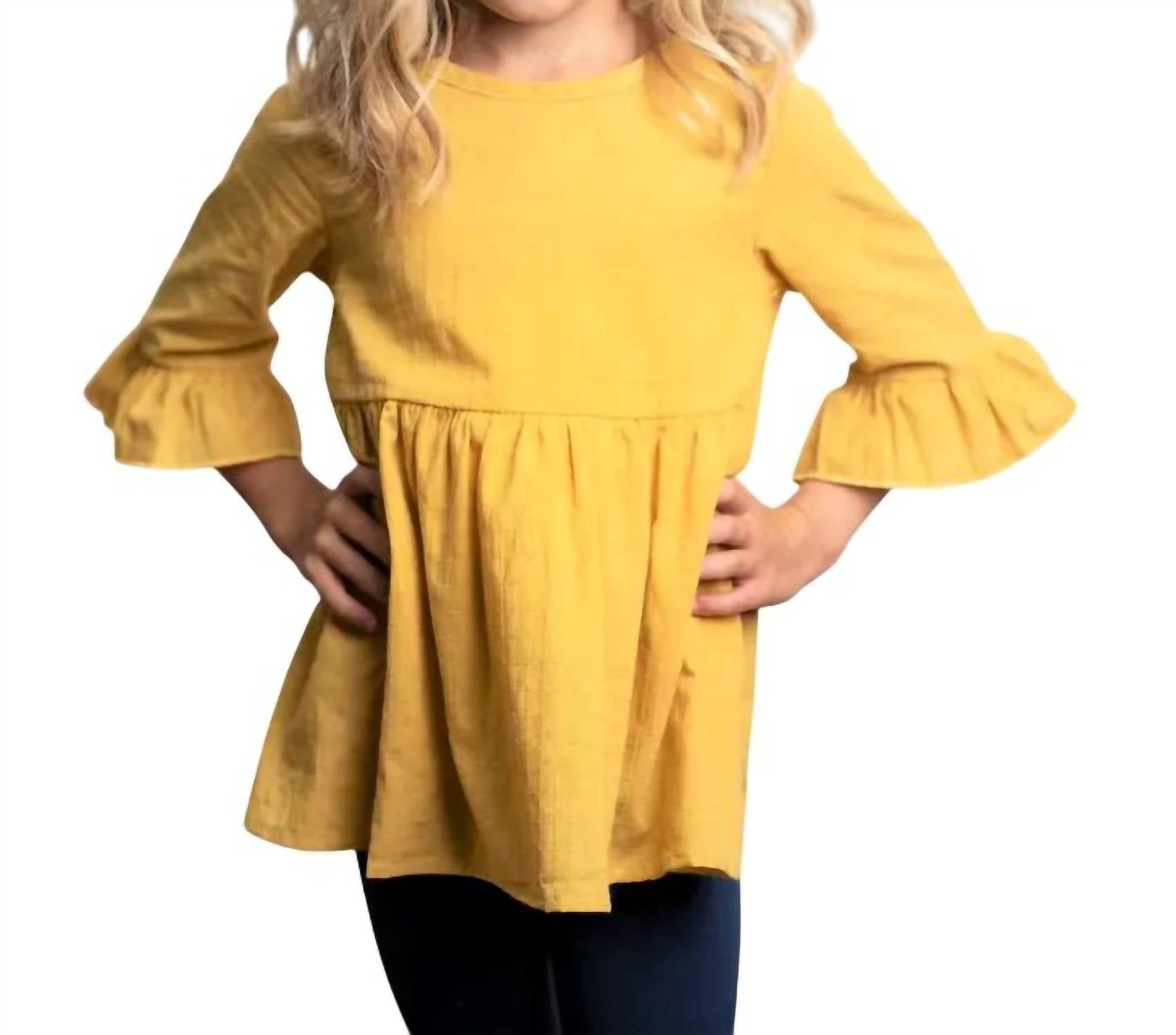 Round neckline. 3/4 ruffled sleeves. Flowy hem. Relaxed fit.