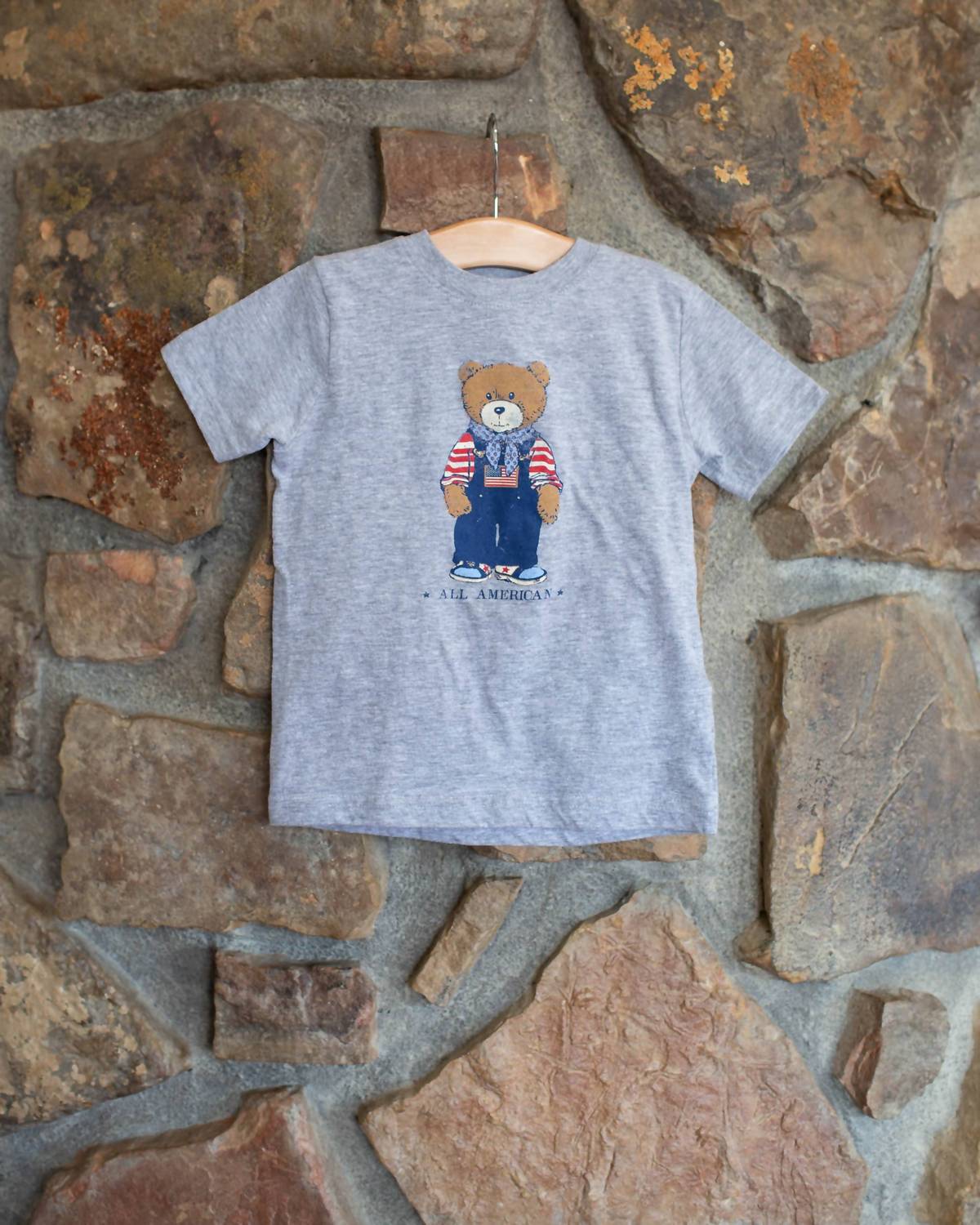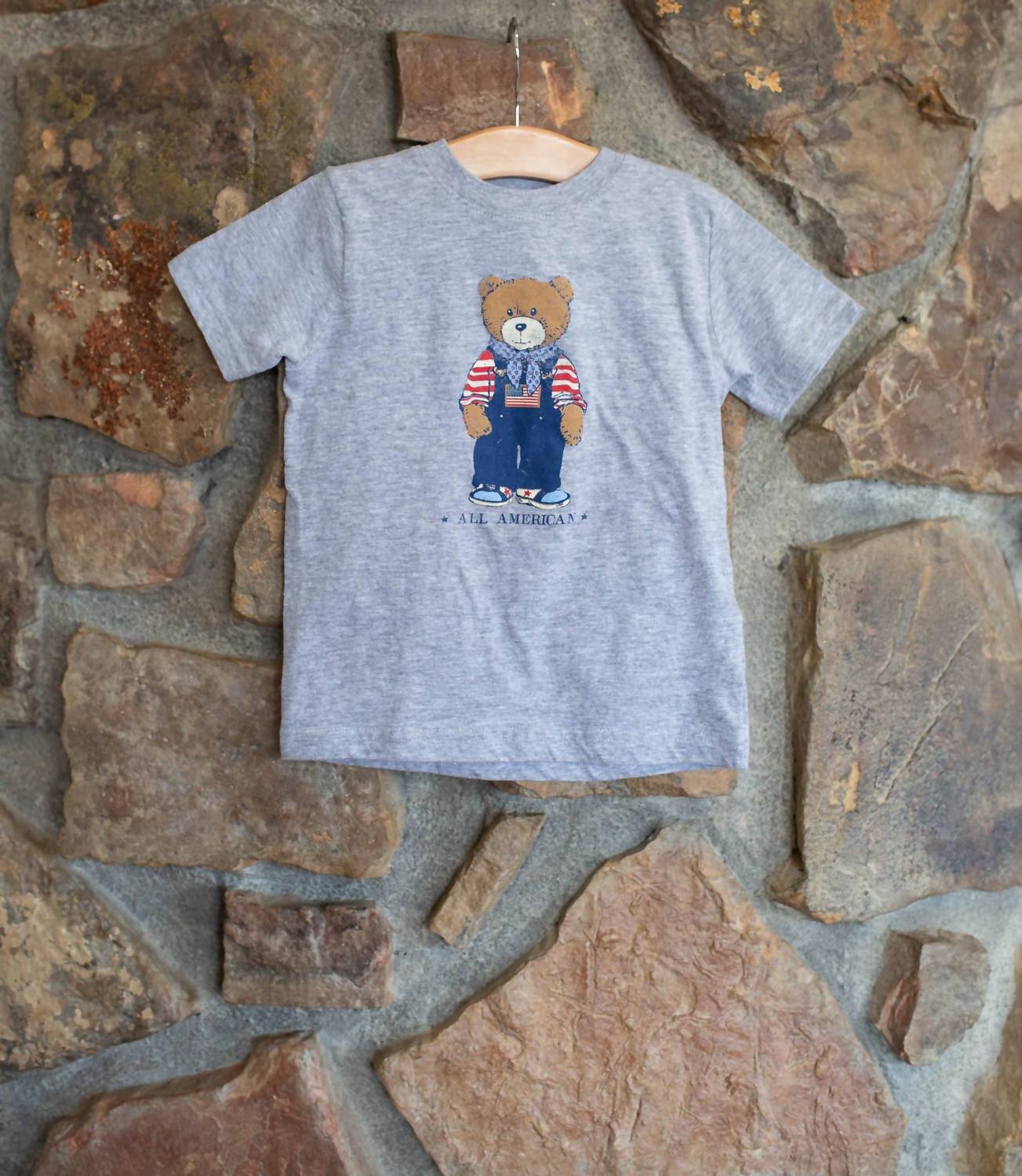 Introducing the LivyLu All American Bear Tee, a must-have for your little one's summer holiday wardrobe. This short sleeve tee in grey features a charming graphic bear design, ideal for spring streetwear or a 4th of July celebration. Made from 100% Airlume Combed & Ringspun Cotton, with variations in Heather blends, the tee is pre-shrunk for lasting wear and features a side seam with a convenient tear away label. Perfect for boys and designed for holiday parties, this adorable top is as comfortable as it is stylish.