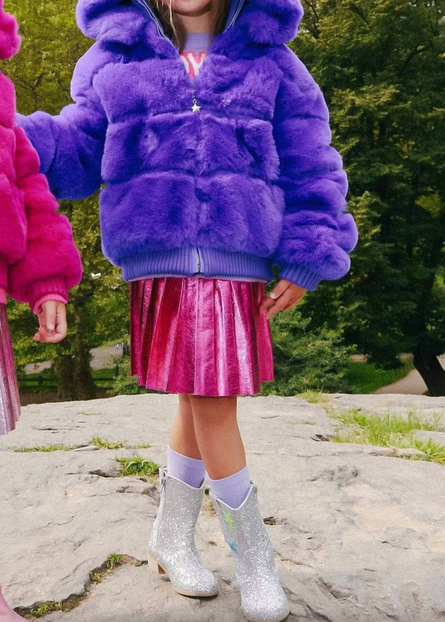 Introducing the Girl's Magic Faux Coat by Lola + The Boys, an essential winter puffer in a vibrant purple hue. This coat features luxurious vegan faux fur on the outside and is lined for added warmth. Care: Hand wash cold or dry clean; do not tumble dry. Perfect for back-to-school occasions, this textured jacket provides both style and comfort.