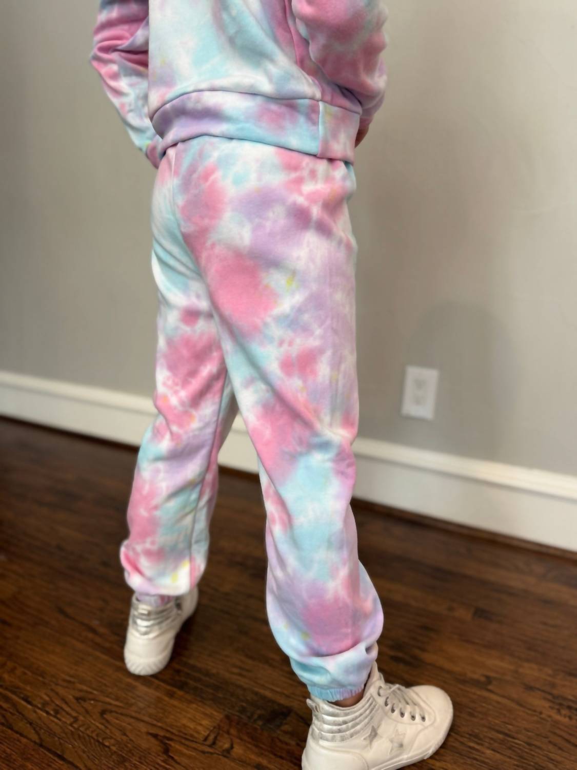 Discover the vibrant Girl's Tie-dye Joggers by Flowers by Zoe, a perfect blend of comfort and style for any tween's wardrobe. Featuring an adjustable drawstring waist and elastic cuffs, these joggers promise a relaxed fit ideal for lounging, school days, or weekend adventures. Crafted from ultra-soft fabric in a dreamy pastel tie-dye palette of pink, blue, and yellow, they're both trendy and comfy for all-day wear. Care: Machine wash. Model is wearing a size medium.