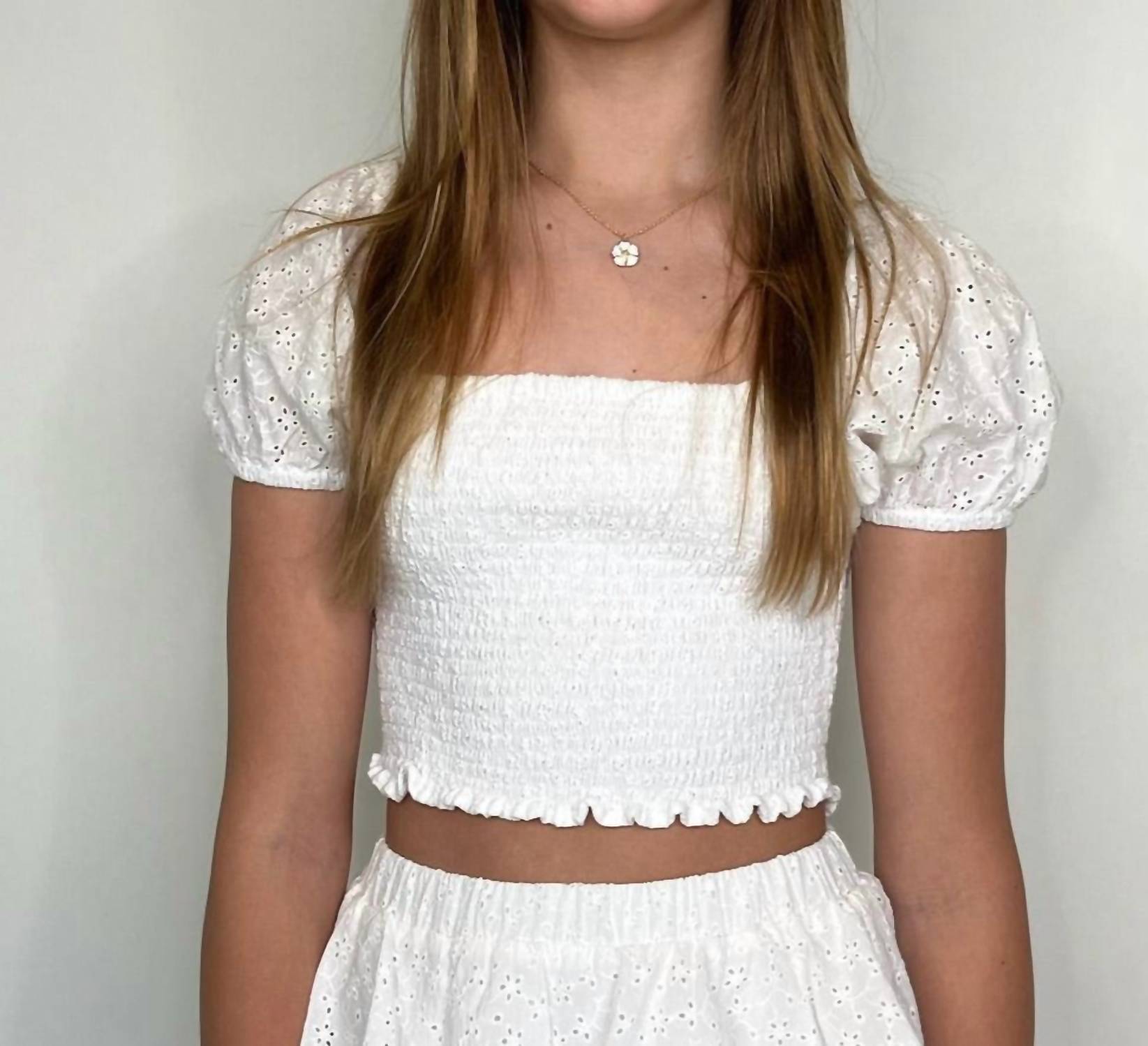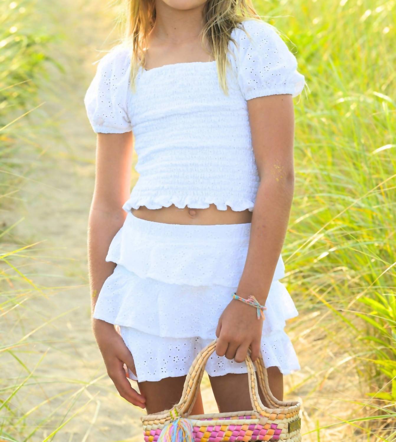 The Walker & Wade Youth Girls' Kiki Top is a charming addition to any young wardrobe, perfect for a summer holiday party. With slightly puffed sleeves and an elastic smocked design, this textured white eyelet blouse offers a whimsical and comfortable fit. Made from 100% cotton, it exudes boho chic style. Care instructions include machine washing on a cold delicate cycle and laying flat to dry for best results.