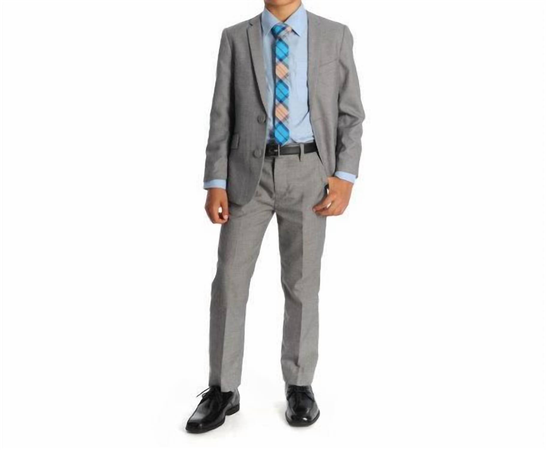 Introduce your child to timeless style with the Appaman Mod Suit Set in Mist, a classic ensemble featuring full-length sleeves and a matching slim fit design. Thoughtfully tailored with a 80% Polyester and 20% Rayon shell, the suit includes a double button closure blazer and tab button, hook & eye closure pants with zip fly for a polished look. The interior is fully lined with 100% Polyester, ensuring comfort throughout the day. Care: Machine wash inside out, do not bleach, tumble dry low, cool iron on reverse.