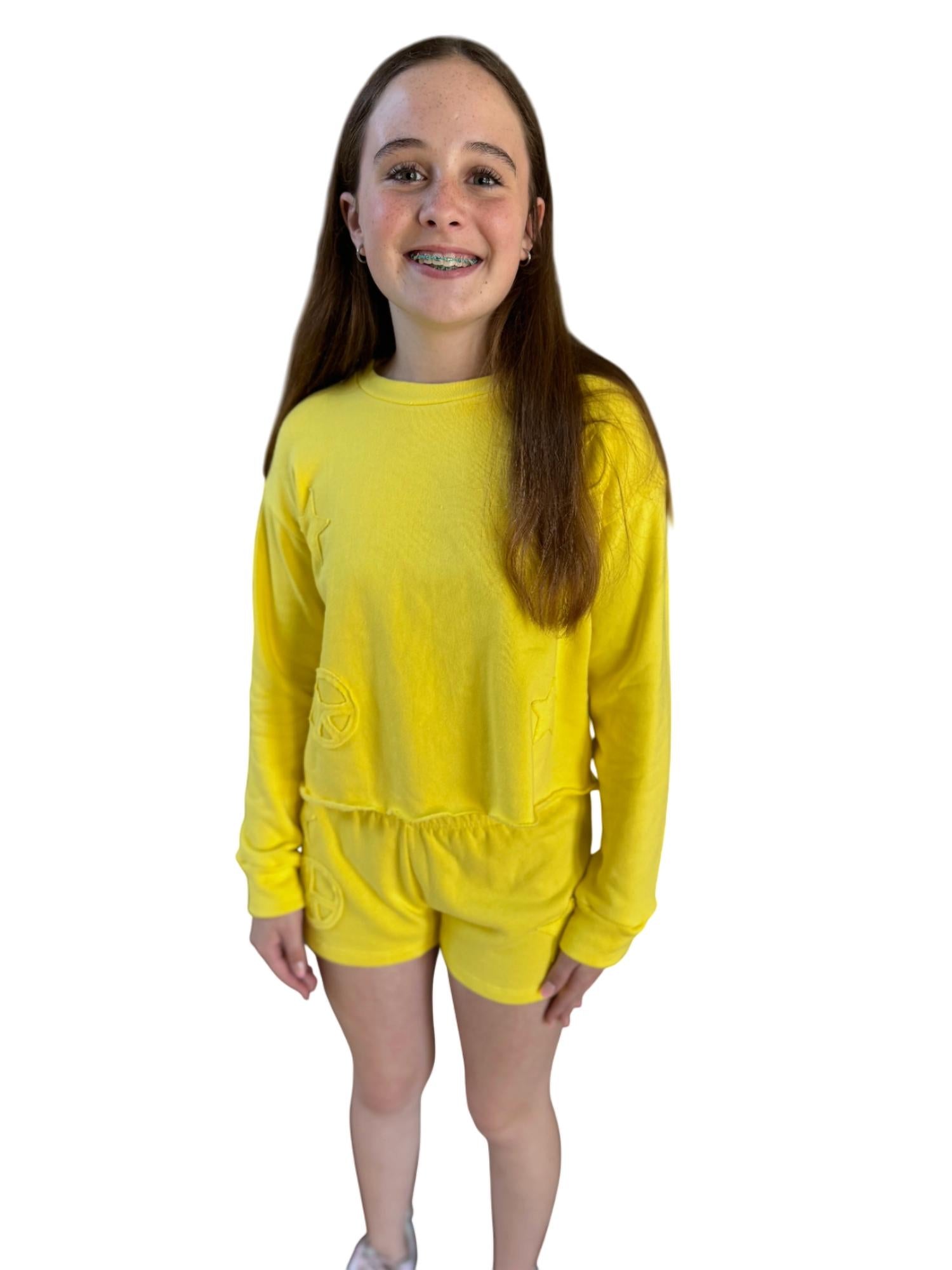 Introduce your little trendsetter to the Girls Fleece Shorts by Flowers by Zoe, made from a blend of 90% cotton and 10% spandex for comfort and style. These yellow shorts feature an elastic waist and charming peace and star appliques on the thighs, effortlessly pairing with their matching sweatshirt or a simple tank top. Care for them with a gentle hand wash to maintain their vibrant look.