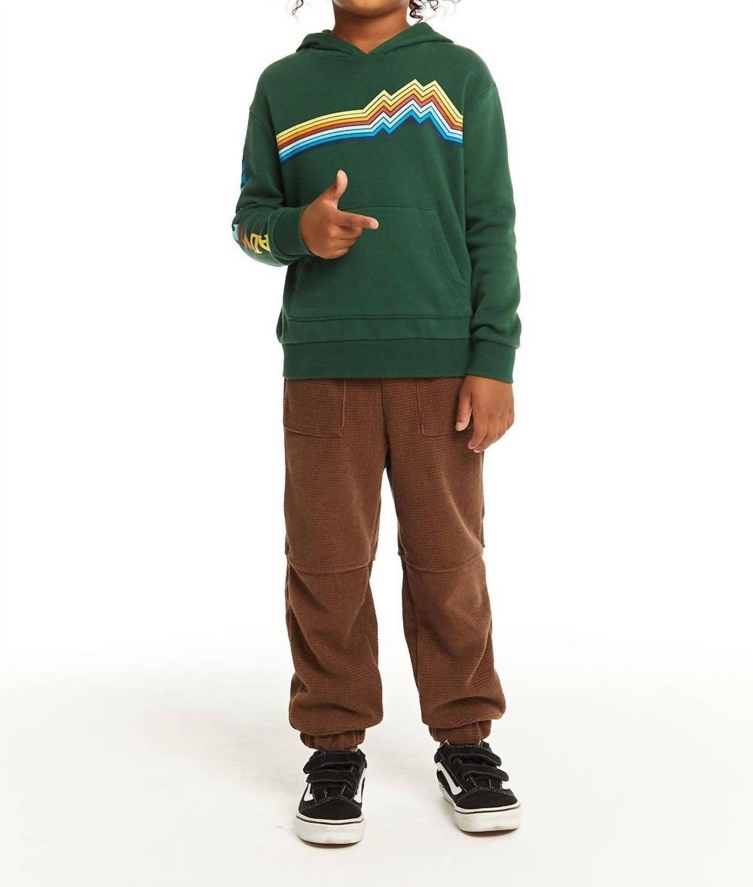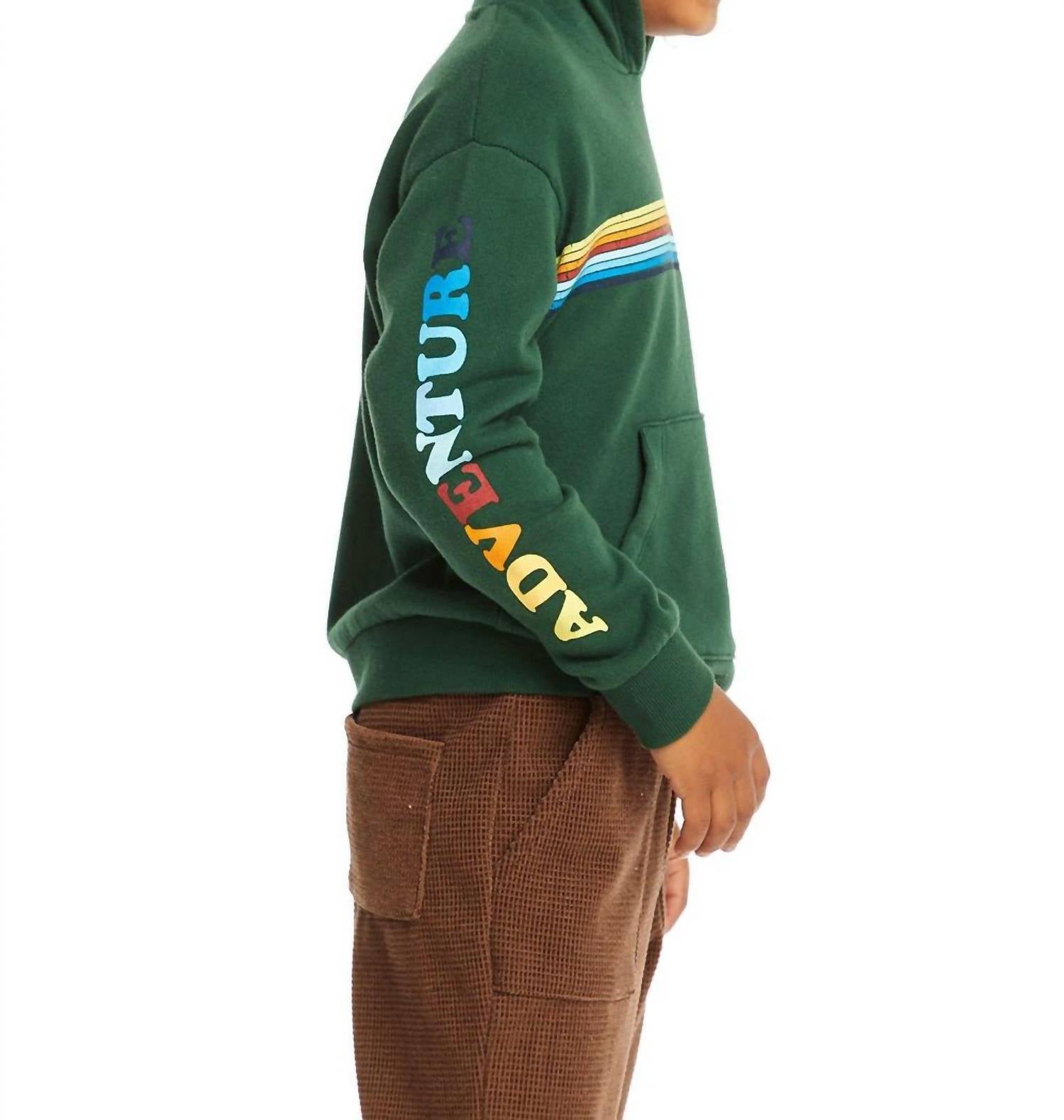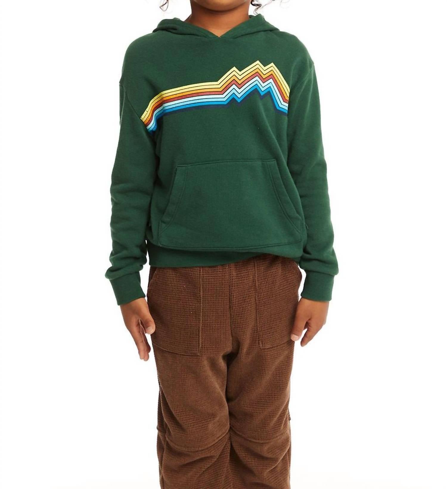 This bold eden green hoodie features a captivating graphic of a rainbow mountain range across the chest, perfect for a playful and stylish look. Made from 100% cotton, it promises comfort and durability, with convenient machine wash care.