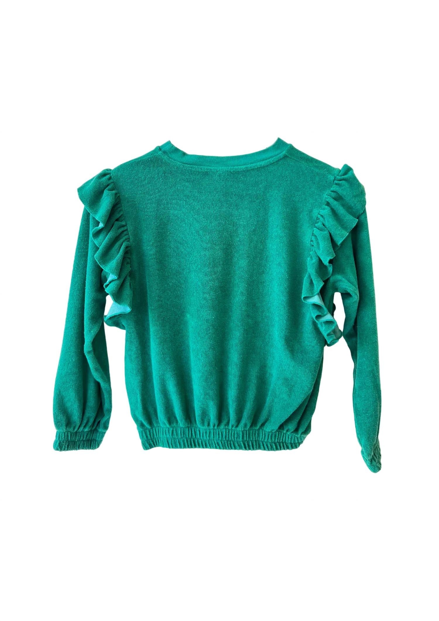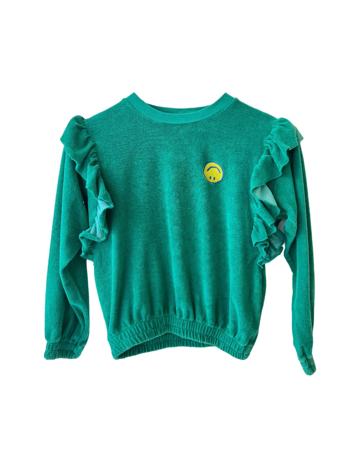 Features a charming smiley graphic patch and unique ruffle shoulder detail. Crew neckline. Long sleeve. Pullover. Made from soft terry cloth.