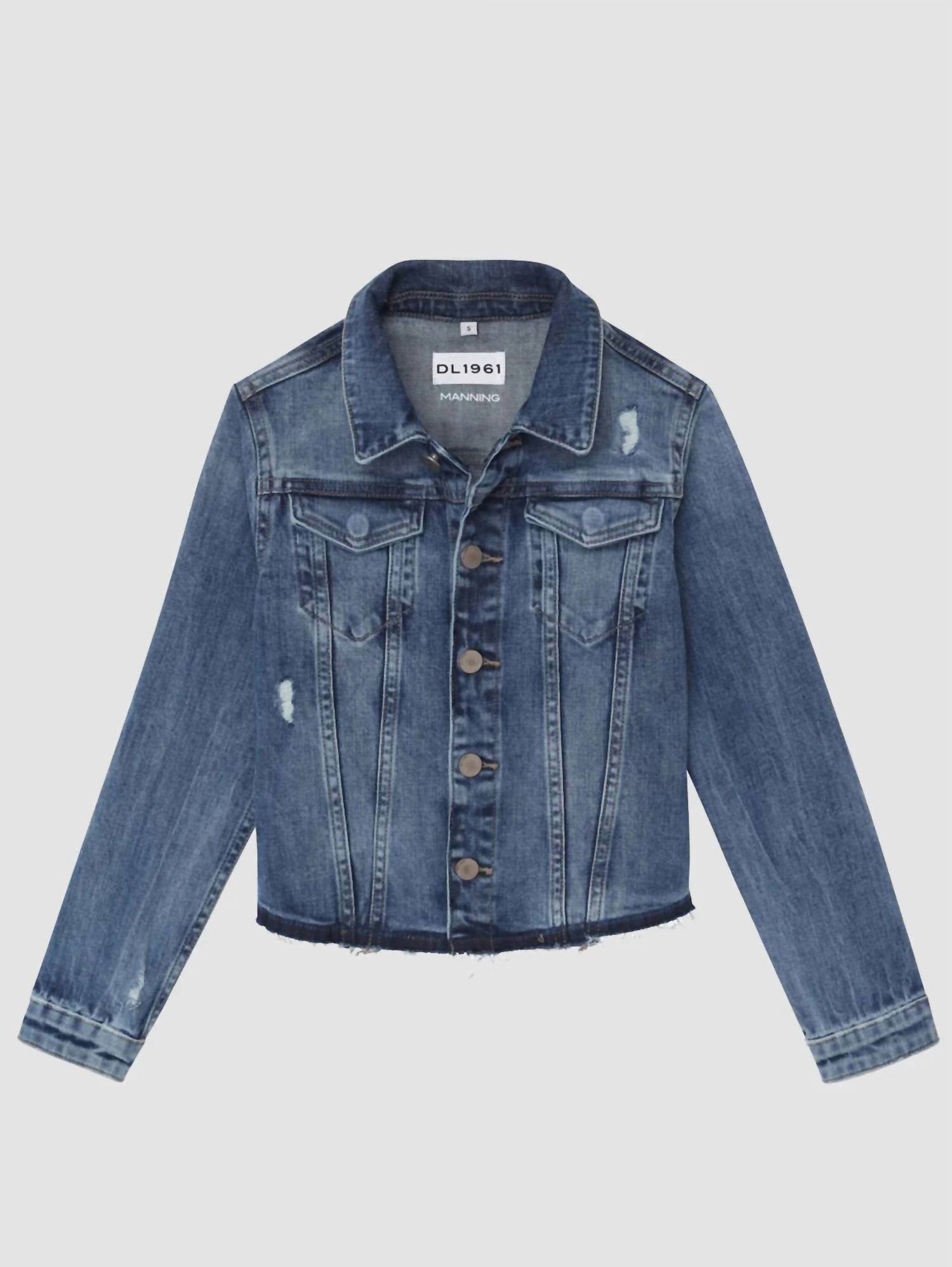 Meet the Girl's Manning Denim Jacket by DL1961 - Kids', a stylish spring essential perfect for travel and the 4th of July. This trucker jacket features a point collar and classic chest pockets, made from a cotton blend of 98% Cotton and 2% Lycra, providing comfort with its DL Performance stretch technology. The mid-indigo wash with small destructions, raw released hem, light sanding, and textured look add a trendy, preppy touch. Button front closure. Machine wash cold, hang dry.