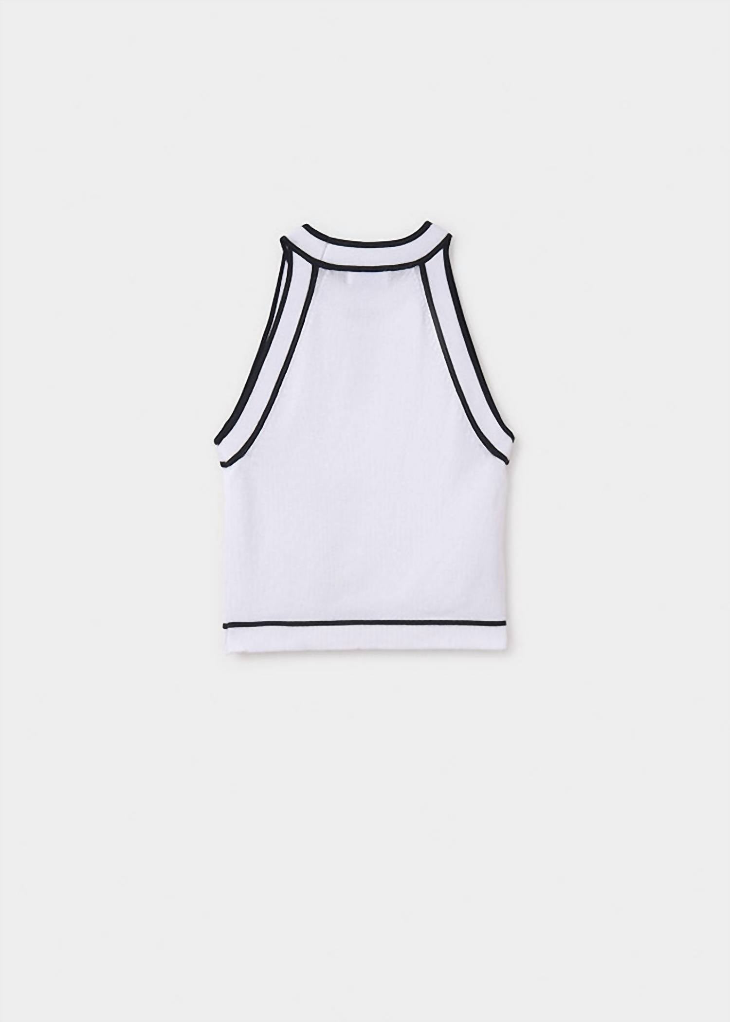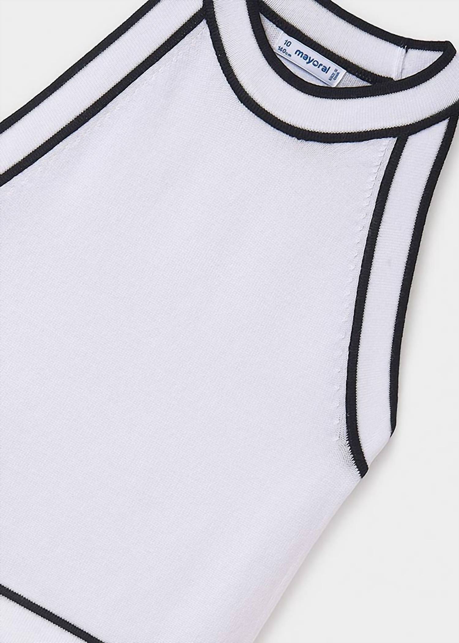 Discover the Girls' Knit Contrast Tank by Mayoral, a chic addition to your summer wardrobe. This solid-patterned top combines a classic white shade with a striking black border, perfect for vacation settings or Mother’s Day celebrations. It's crafted from an 87% viscose and 13% polyamide blend, ensuring superior comfort and durability. Easy care with machine wash and tumble dry instructions, this halter neck tank is designed to fit seamlessly into a preppy trend this season.