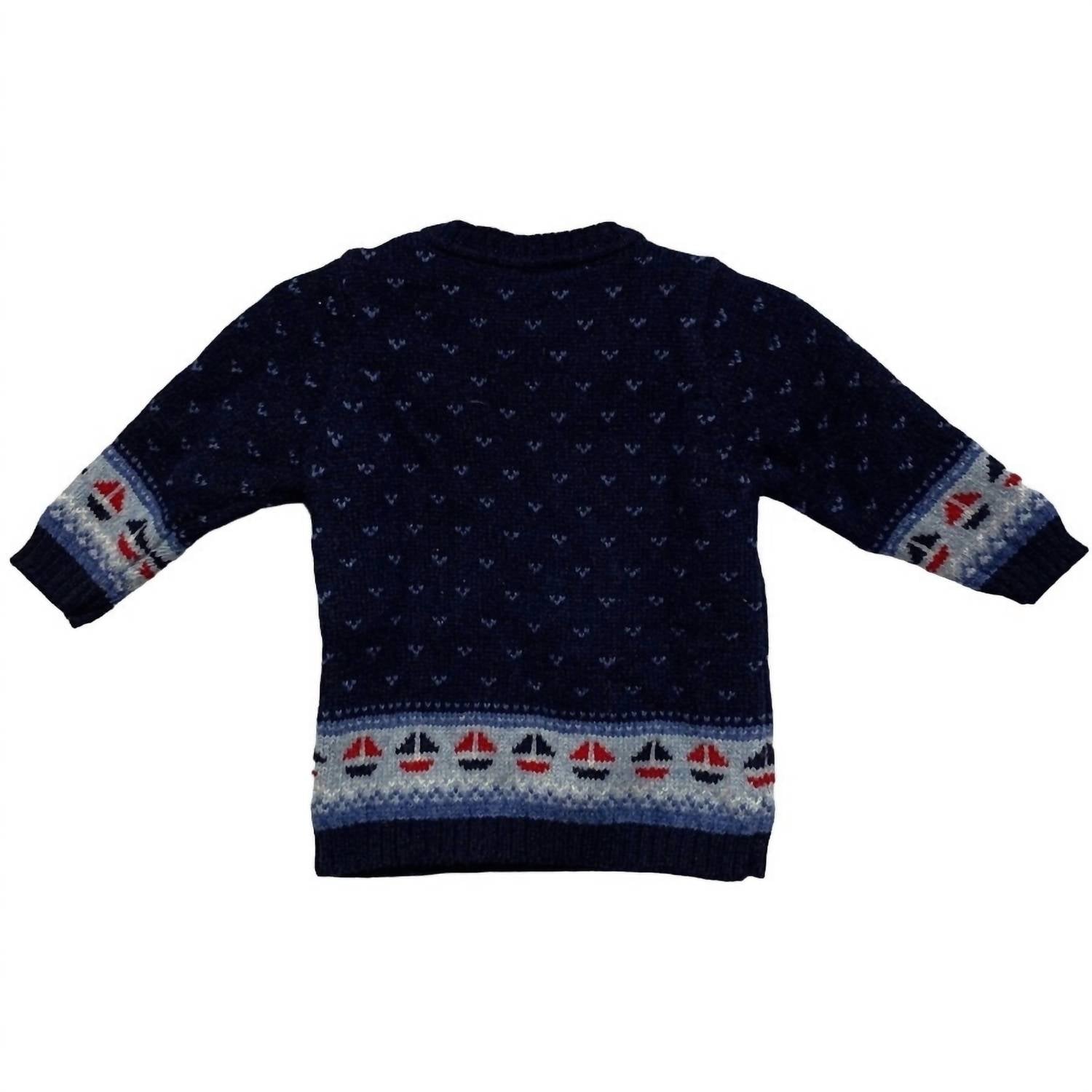 Introducing the JoJo Maman Bebe Boys' Long Sleeve Wool Sailboat Sweater, an endearing piece in a classic navy hue. Crafted from a wool blend with 80% Lambswool and 20% Nylon, this sweater offers both warmth and comfort. Designed in Turkey, it features a charming sailboat pattern and measures 10" across the chest with a length of 14". Easy to care for, this sweater is machine washable.