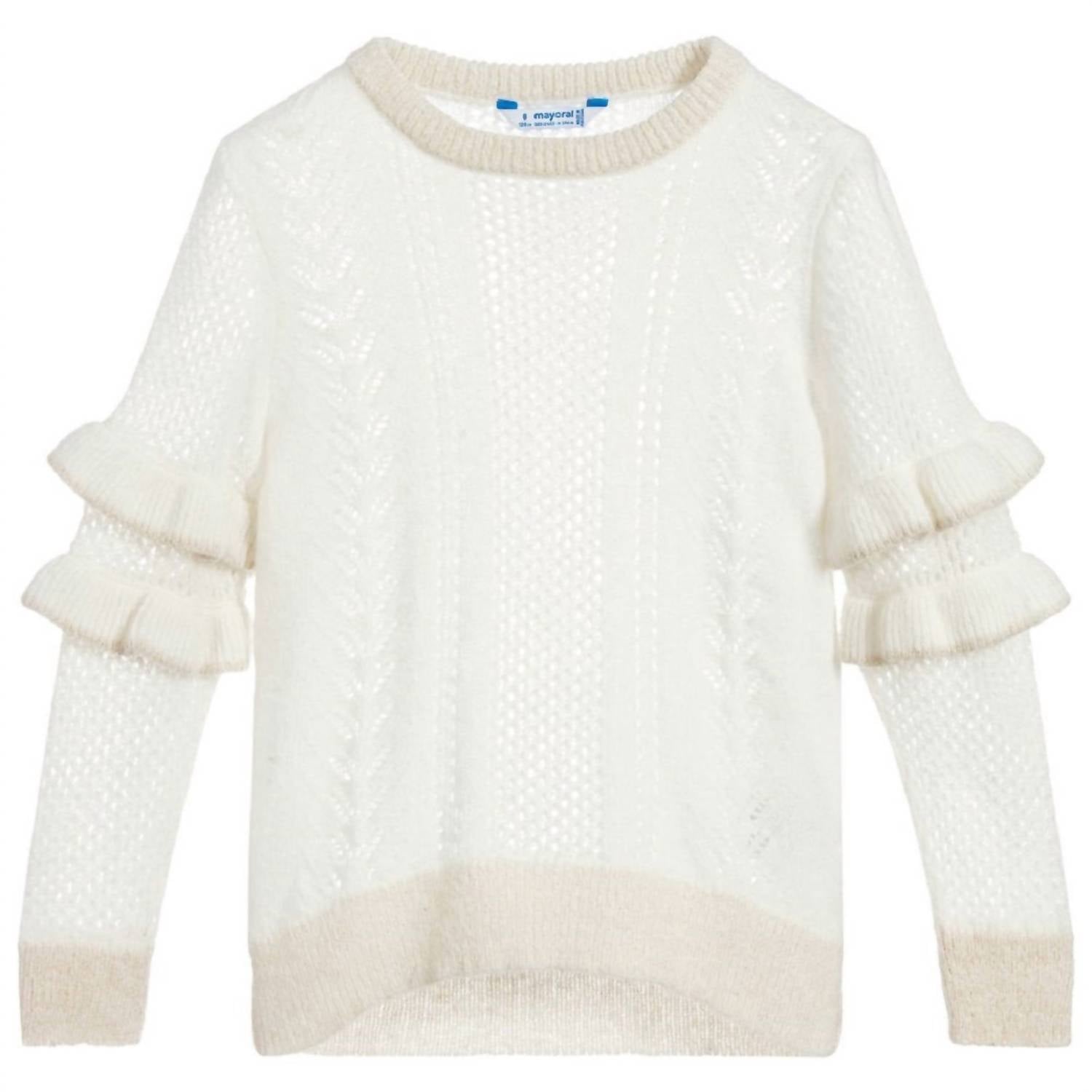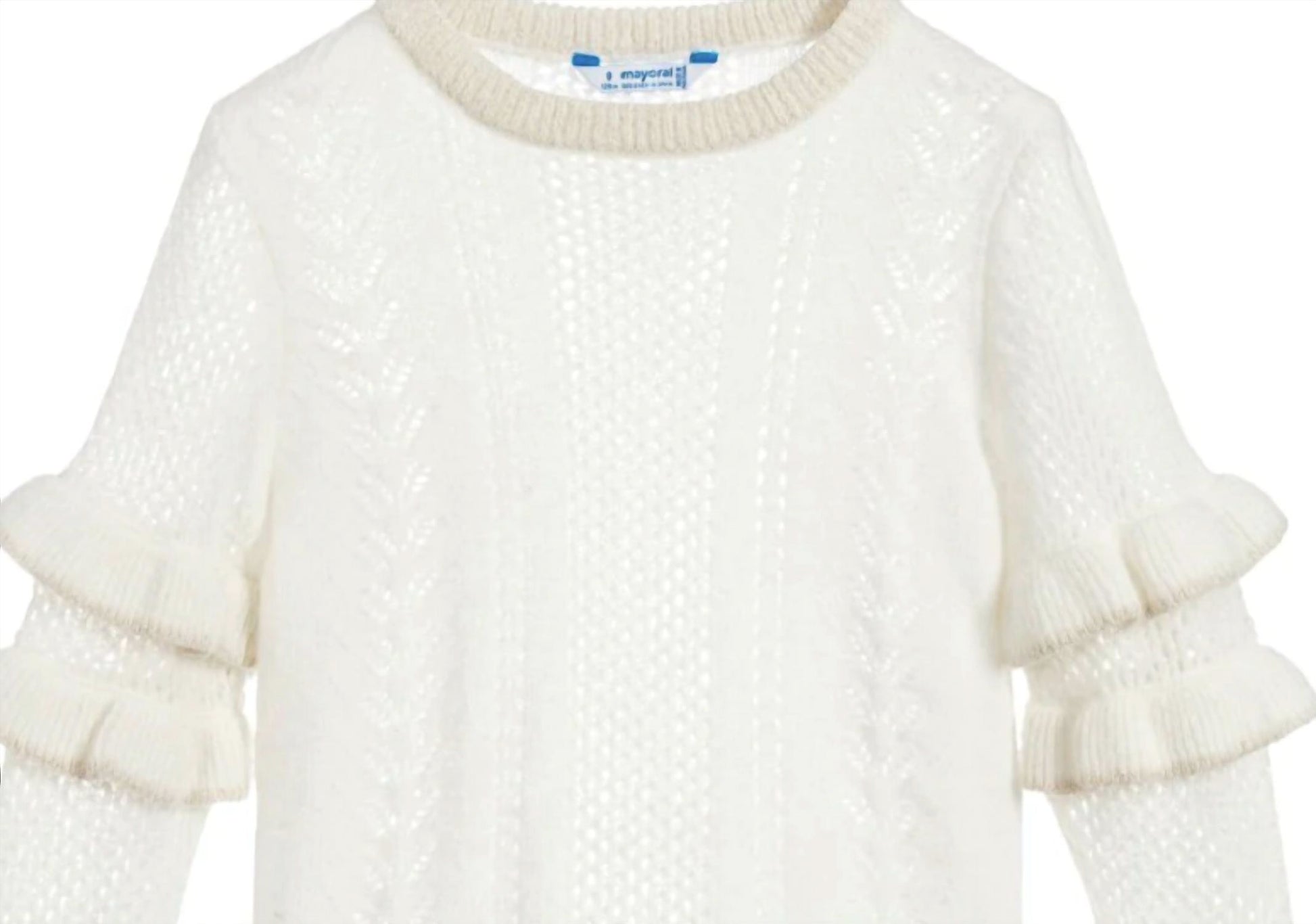 Introducing the Girl's Ruffle Sleeve Shimmer Sweater by Mayoral, a luxurious natural hue sweater perfect for travel occasions and fall seasons. This pull-on style showcases ruffle detailing on each arm with intricate crochet patterns across the body, accented by gold shimmer ribbing on the neckline, waistband, and ruffles. Composition: 59% Acrylic, 30% Polyamide, 10% Mohair, 1% Metallic Fiber. Care: Use wool program while washing; machine wash cold on delicate, do not bleach, reshape and lay flat to dry, cool iron, or dry clean if needed.