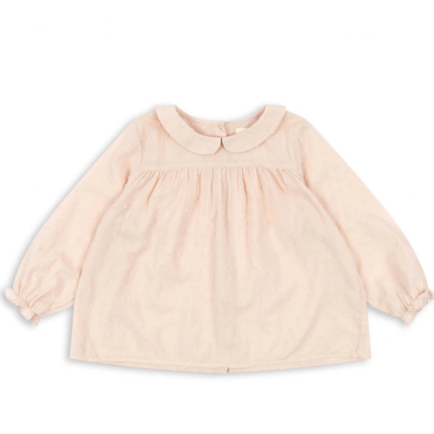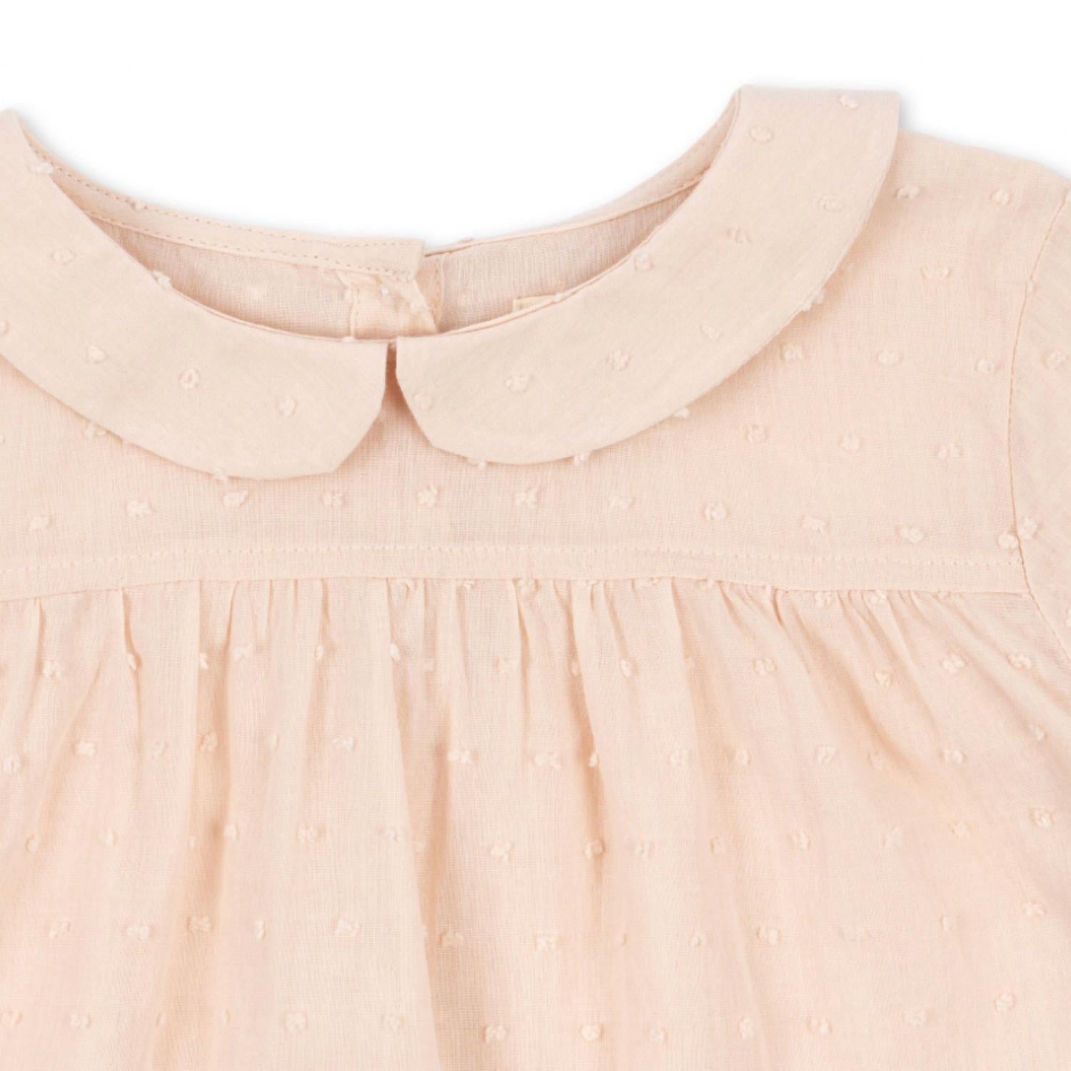 Crafted in 100% organic cotton voile that boasts embroidered dots for a delightful textured pattern. This light and breathable fabric offers a soft, gentle touch against the skin, complete with a classic round collar for timeless appeal. Made in Denmark.
