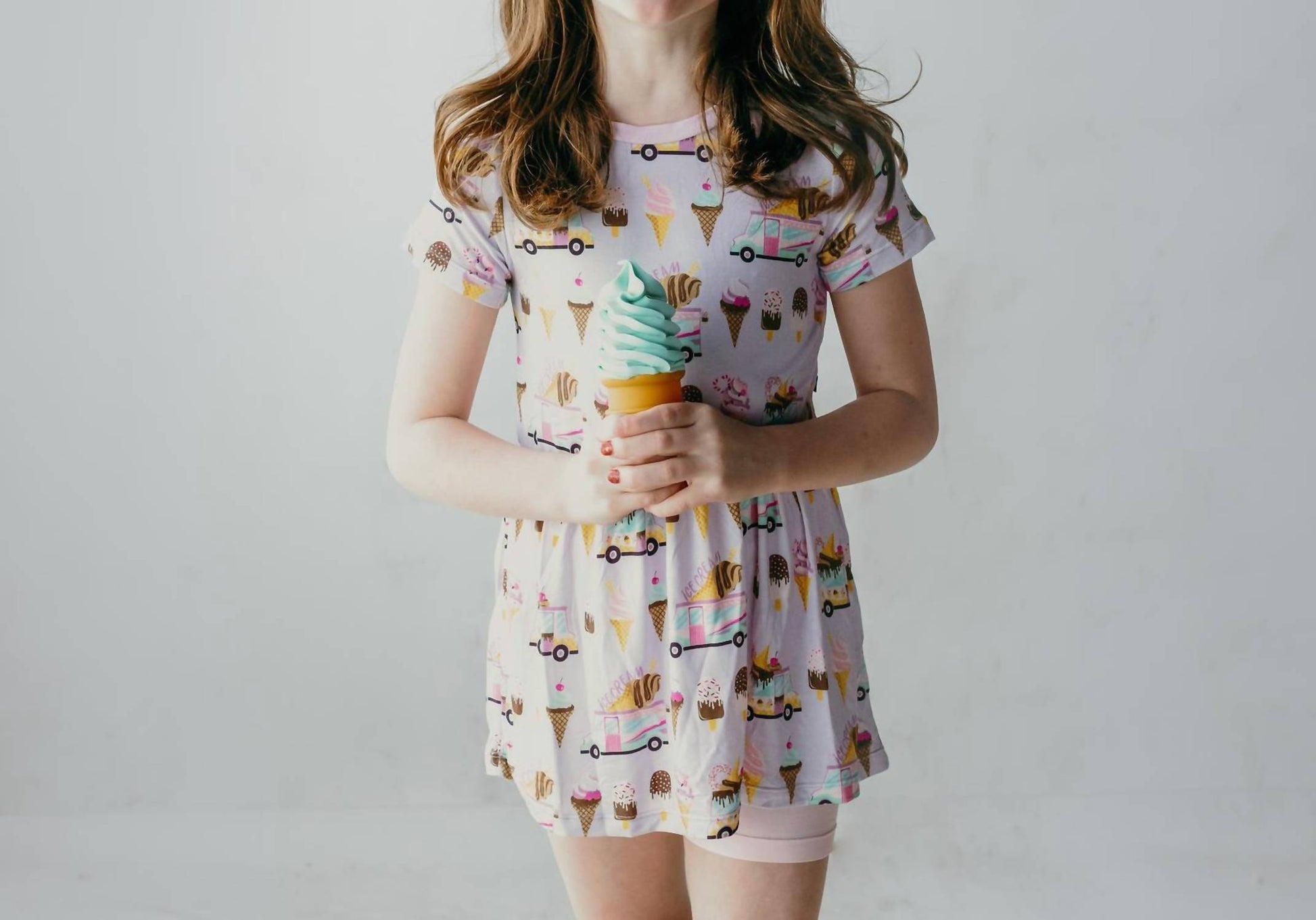 Introducing the KICKEE Girl's Short Sleeve Playtime Outfit Set, a delightful and comfy ensemble in a playful Thistle Ice Cream Truck hue. This set features a short-sleeve peplum top paired with matching legging-style shorts, both crafted from KICKEE's Signature Blend of 95% Viscose from Bamboo and 5% Spandex. The shorts feature an elasticized waist for easy pull-on styling, ensuring comfort throughout the day. Care: Machine wash and tumble dry low.