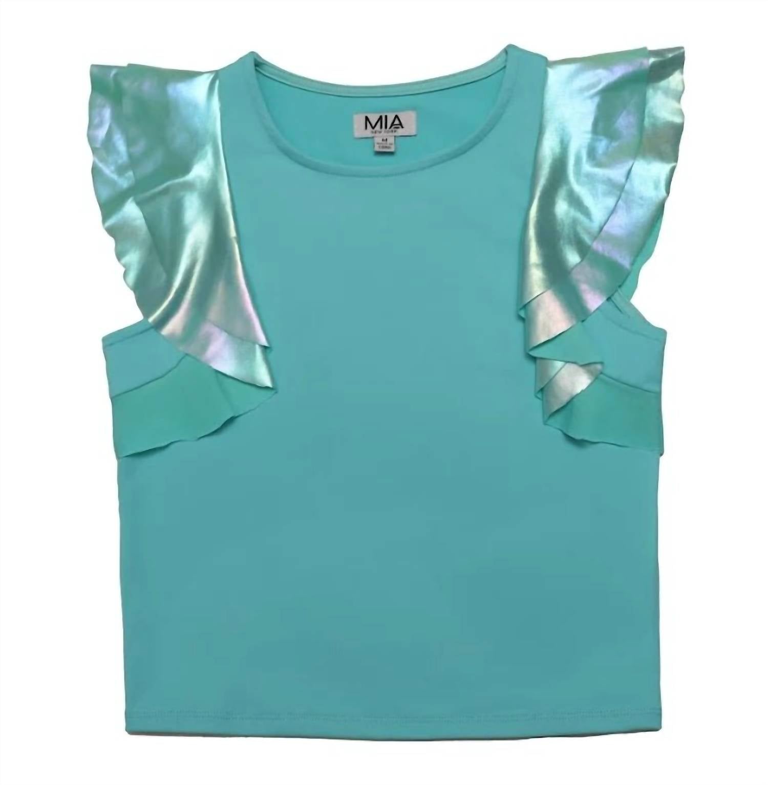Elevate her style with the Aqua Blue Flutter Sleeve Top by MIA, designed for the fashion-forward tween. This trendy blouse features bold metallic flutter sleeves paired with a soft, stretchy aqua blue bodice, made from 90% polyester and 10% spandex. It's easy to care for with simple machine wash and line dry instructions, making it perfect for any occasion from school to special events. Ideal for those who love to stand out, this versatile piece is a must-have addition to her wardrobe.