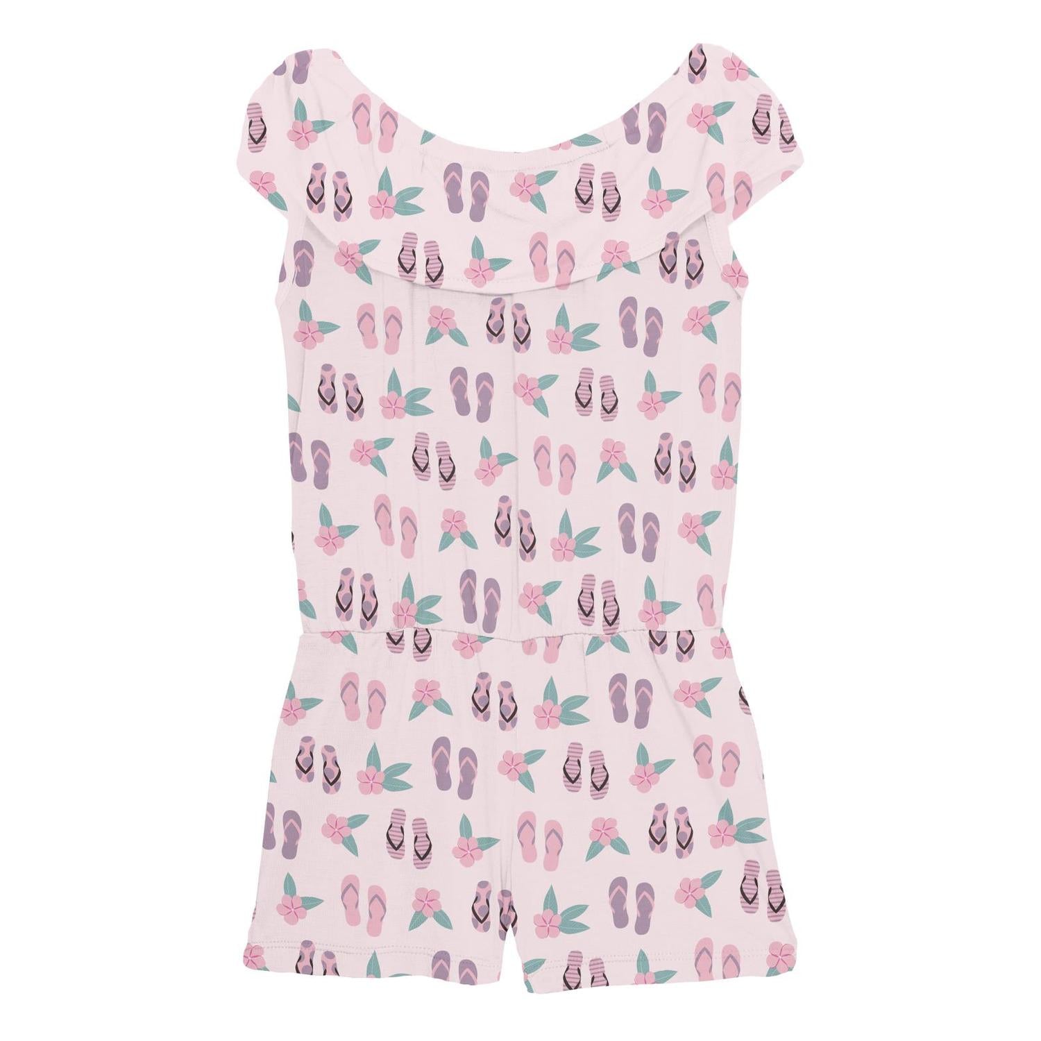 Introducing the Girl's Summer Romper by KICKEE in the delightful Shrinking Violet Flip Flops And Flowers print, perfect for a vacation fiesta. This romper is crafted from a buttery-soft signature fabric featuring a 95% viscose from sustainably grown bamboo and 5% spandex blend for stretch and comfort. Designed with a relaxed fit and peasant-style collar that can be worn up or down, it's lightweight, breathable, and rated UPF 50+ for sun protection. Care is easy with machine wash inside out on a gentle cycle and tumble dry low, ensuring you stay cool and stylish wherever you sway.