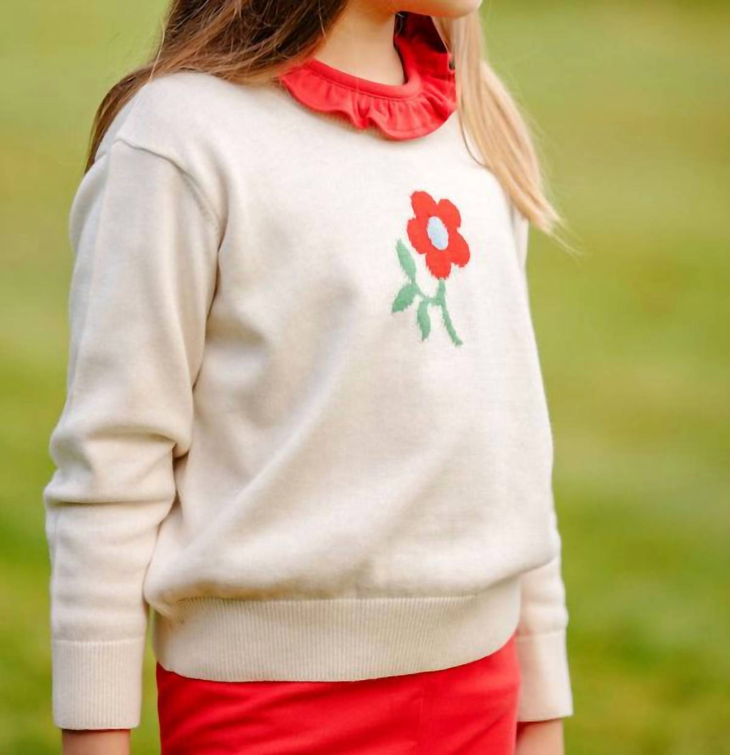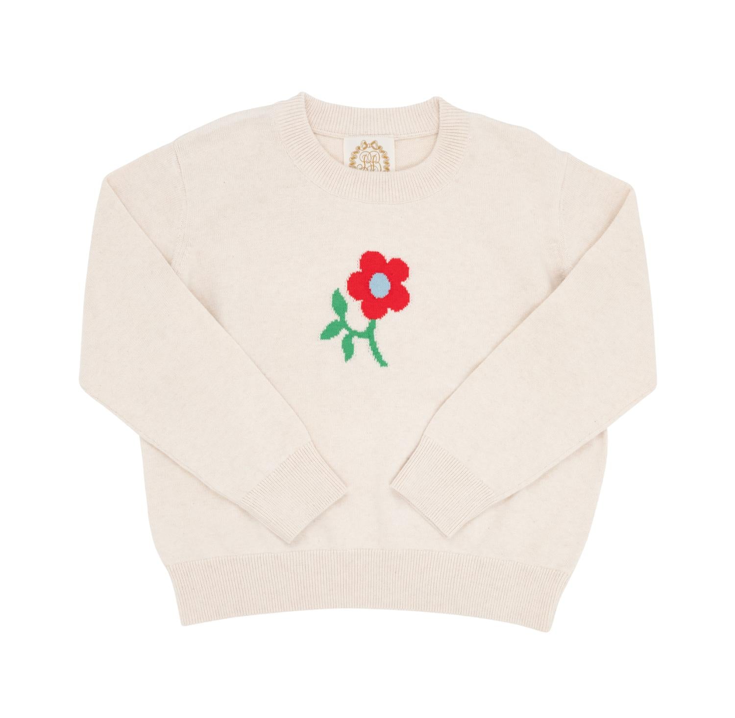 Introducing the Girl's Isabelle's Intarsia Sweater by The Beaufort Bonnet Company, a charming choice for any fall occasion. Crafted from 100% cotton yarn, this sweater features a delightful flower intarsia on the chest, perfect for pairing with Mitzy Sues. The Sandy Springs Stone color brings a touch of elegance, making it ideal for church outings or Thanksgiving celebrations. Care: Machine wash cold on a gentle cycle with like colors, do not bleach; tumble dry low but lay flat to dry for best results.