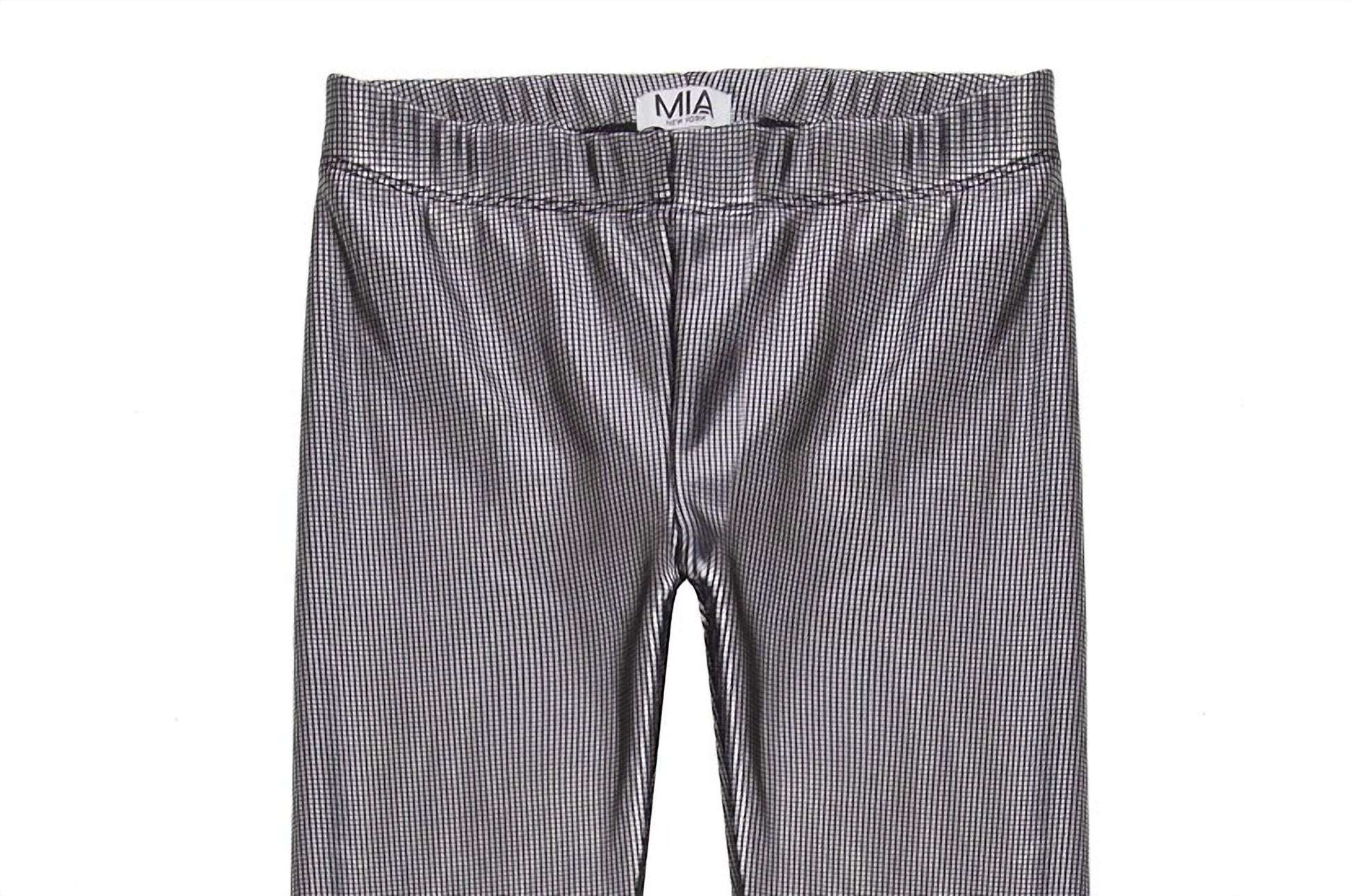 Elevate your look with MIA's Girl's Disco Leggings, crafted for a holiday party sparkle and minimalist style. These gunmetal grey leggings boast a silver metallic coating in a micro grid pattern, offering the ultimate sheen reminiscent of a disco ball, and feature an elastic banded pull-on waist with a full-length fitted silhouette. Composition: 95% Polyester, 5% Spandex. Care for these leggings involves hand washing cold separately, line drying, and a cool iron if needed, while avoiding ironing the decoration and dry cleaning.