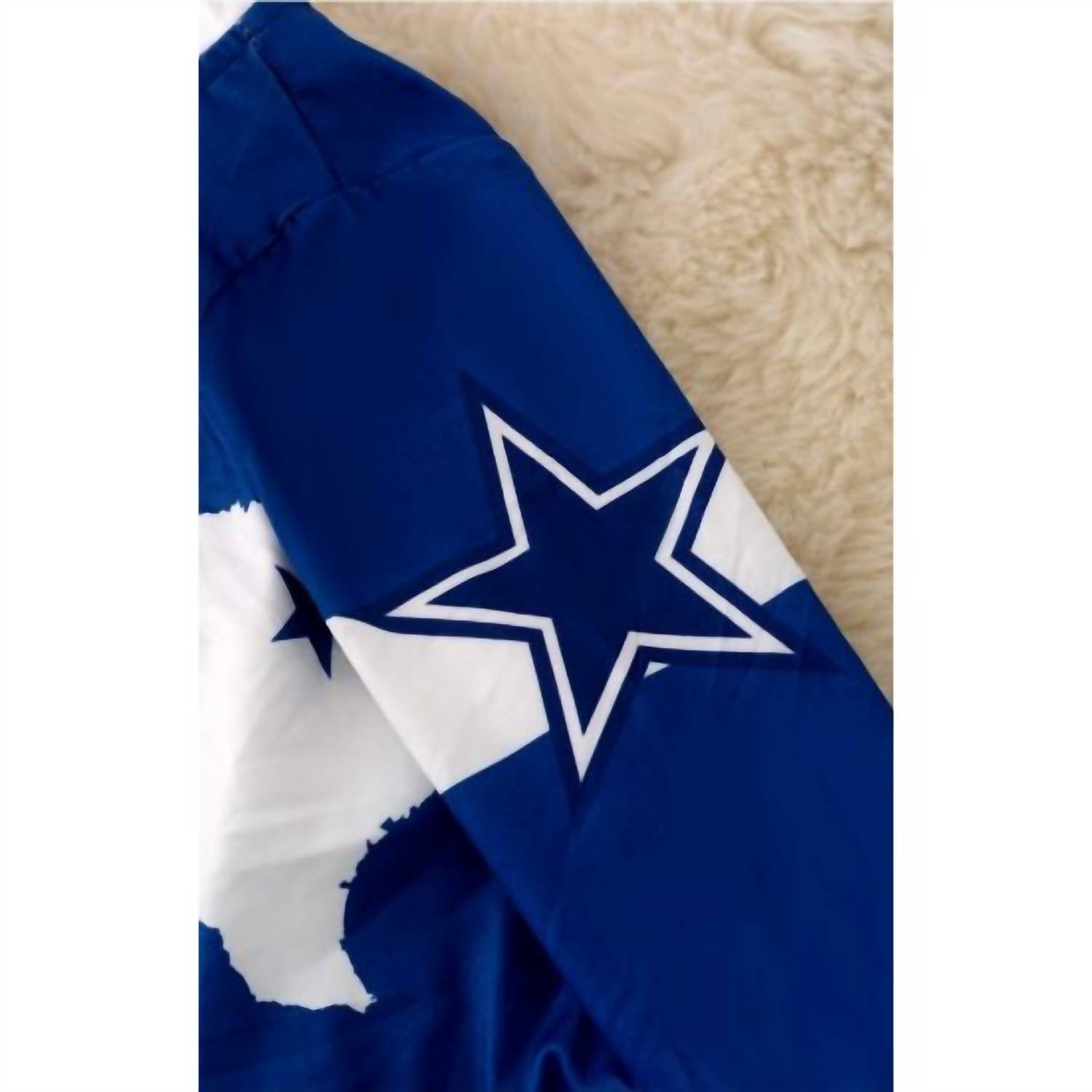 Let your little fan celebrate their Texas spirit with the KIDSCHARM Kids Cowboys Texas Long Sleeve Top. Crafted from a premium blend of 95% polyester and 5% spandex, this blue and white star-patterned top offers a soft and stretchy fit for all-day comfort. The graphic design features a bold Texas outline with a star and "COWBOYS" across the chest, making it a perfect choice for both game days and casual outings. Ideal for summer, this tee combines Western charm with sporty style for your young fan.
