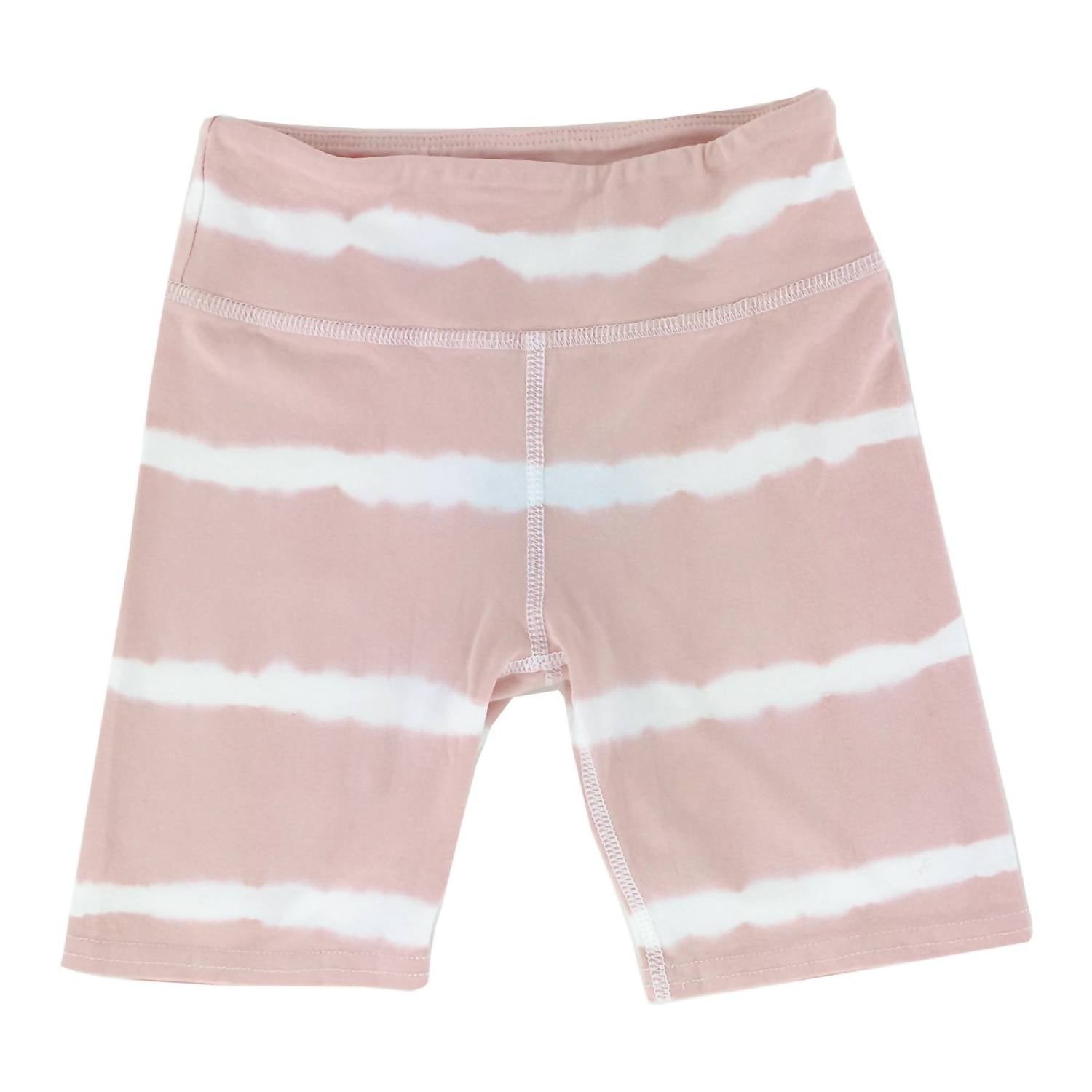 The Girls' Fun In The Sun Bike Short by TINY WHALES is a fun and comfortable option for any outdoor activity. Featuring an elastic pull-on waistband, these shorts are made from a cotton blend with a composition of 97% cotton and 3% spandex, allowing for easy movement. The dusty pink body with white contrasting tie-dye accents adds a trendy touch to your little one's wardrobe, and the piece is proudly made in the U.S.A. Care instructions include machine wash cold and hang to dry, ensuring easy maintenance for busy parents.
