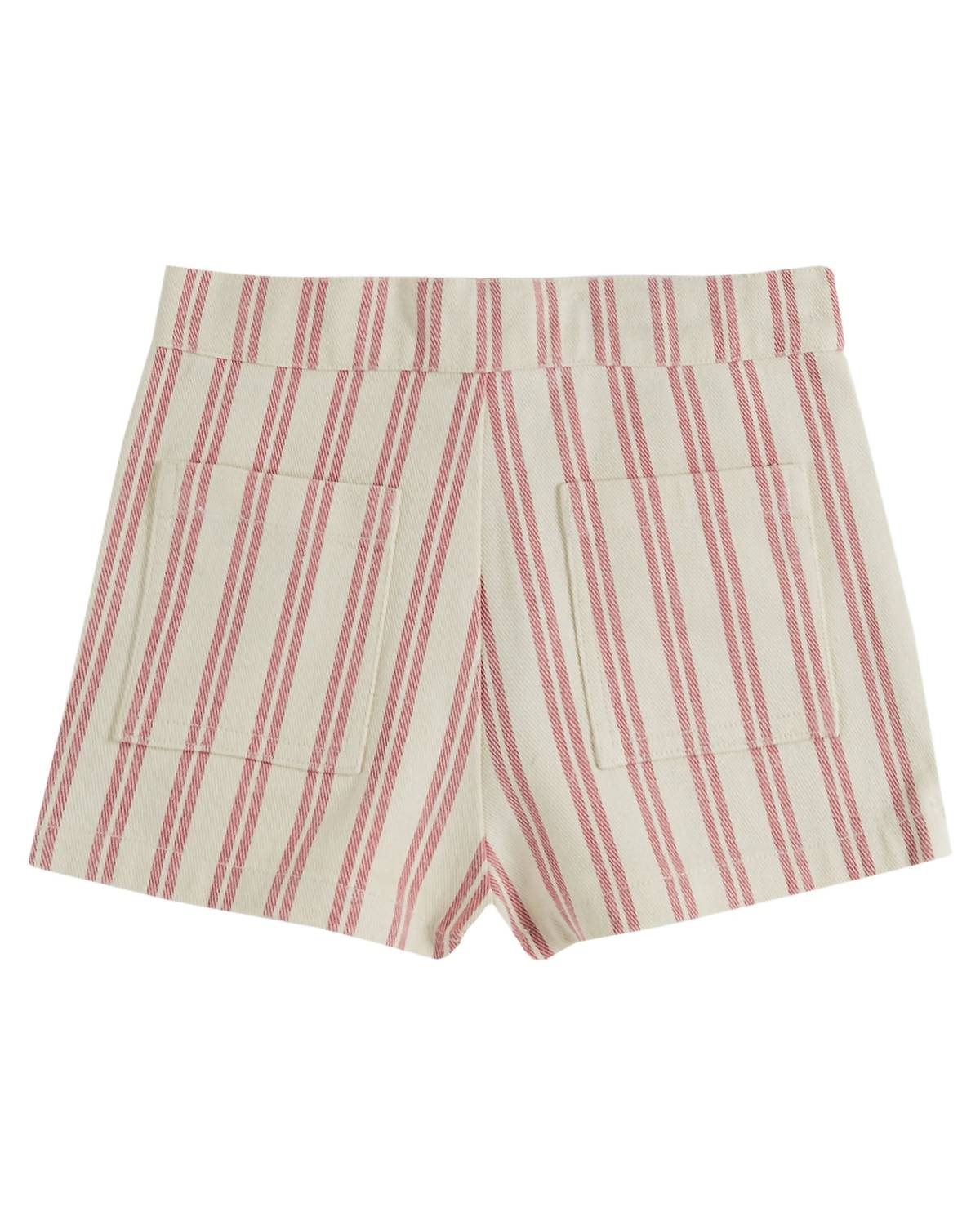 Scalloped edges. Front patch pocket(s). Back patch pocket(s). Zip fly. Button(s) at the waist. Stripe print. 100% Cotton. Made in India.
